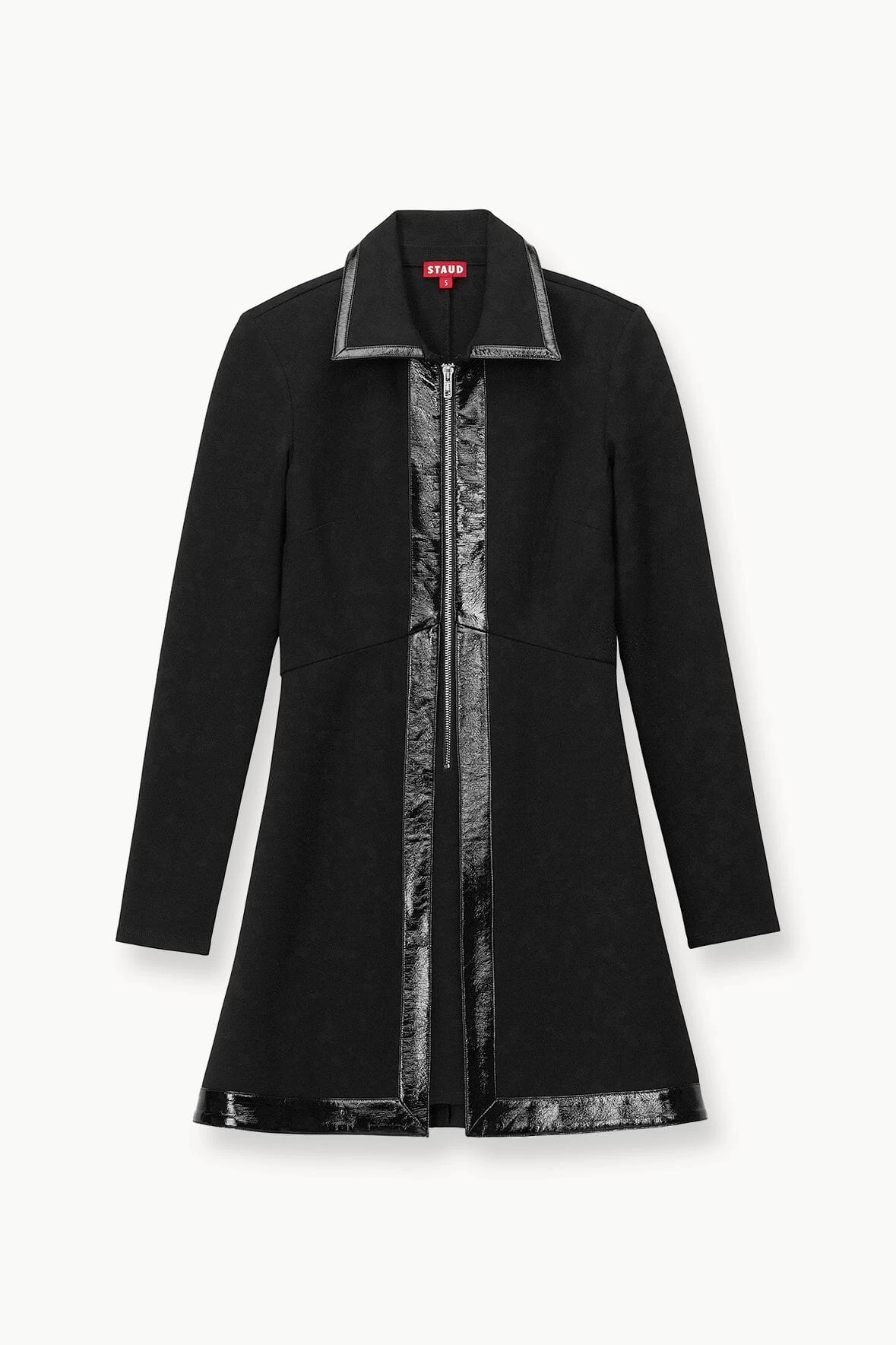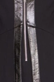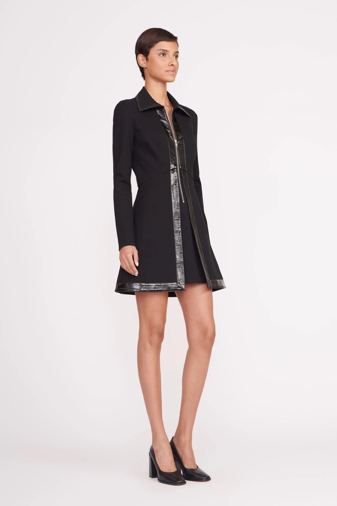 A long-sleeved mini dress crafted in our comfortable ponte fabric with a patent leather trim and a front zip detail.