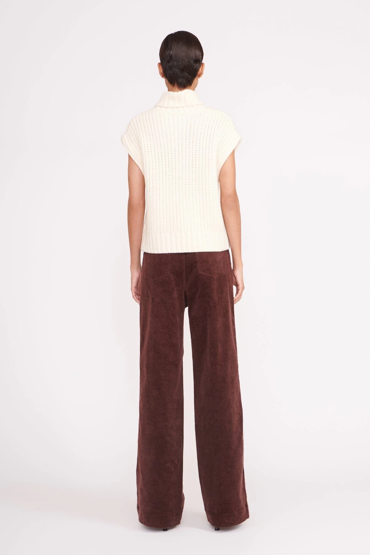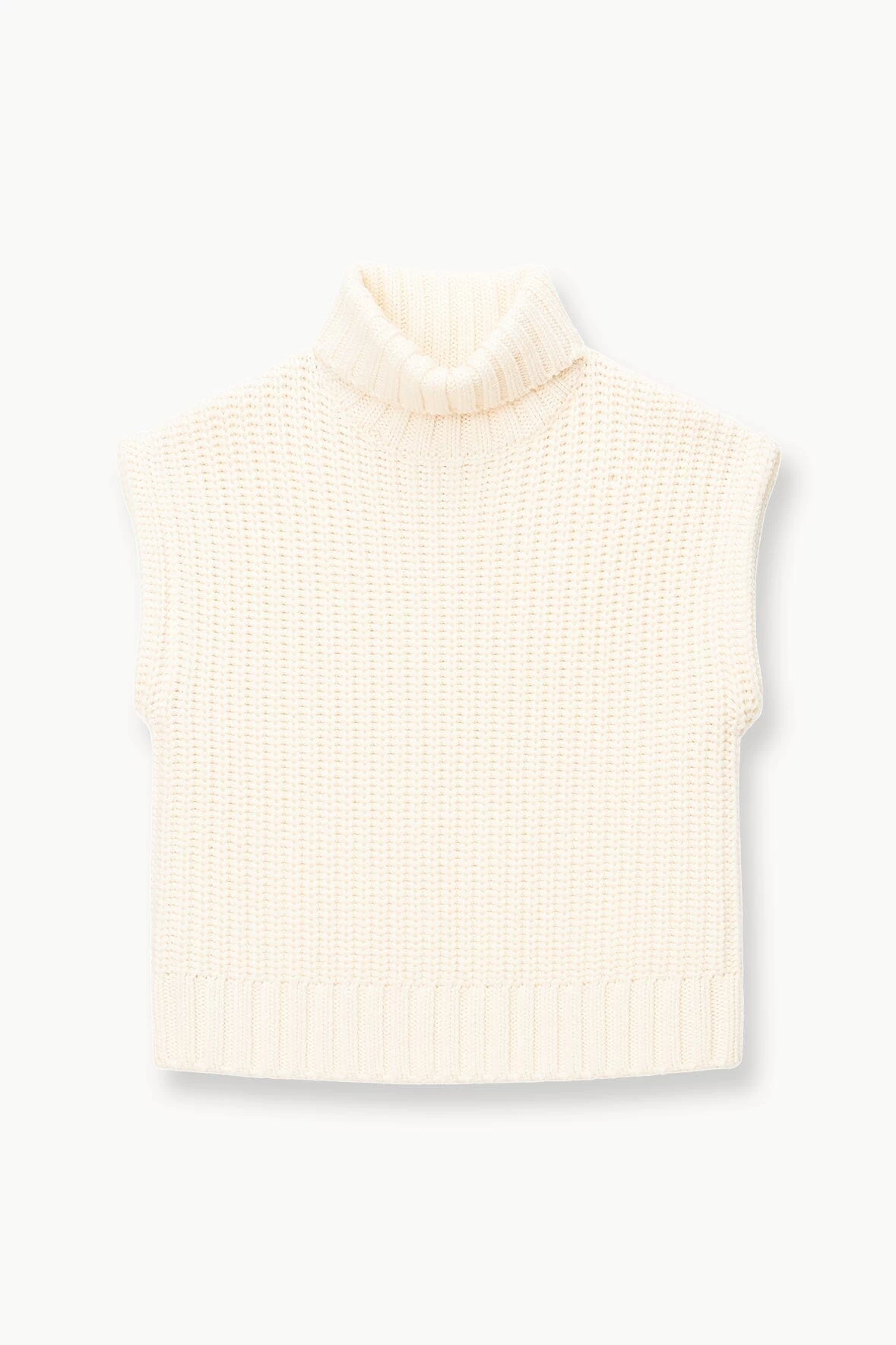 A boxy, short sleeve sweater vest made out of merino wool. This style features short sleeves and a mock neck offering a transitional layering piece.