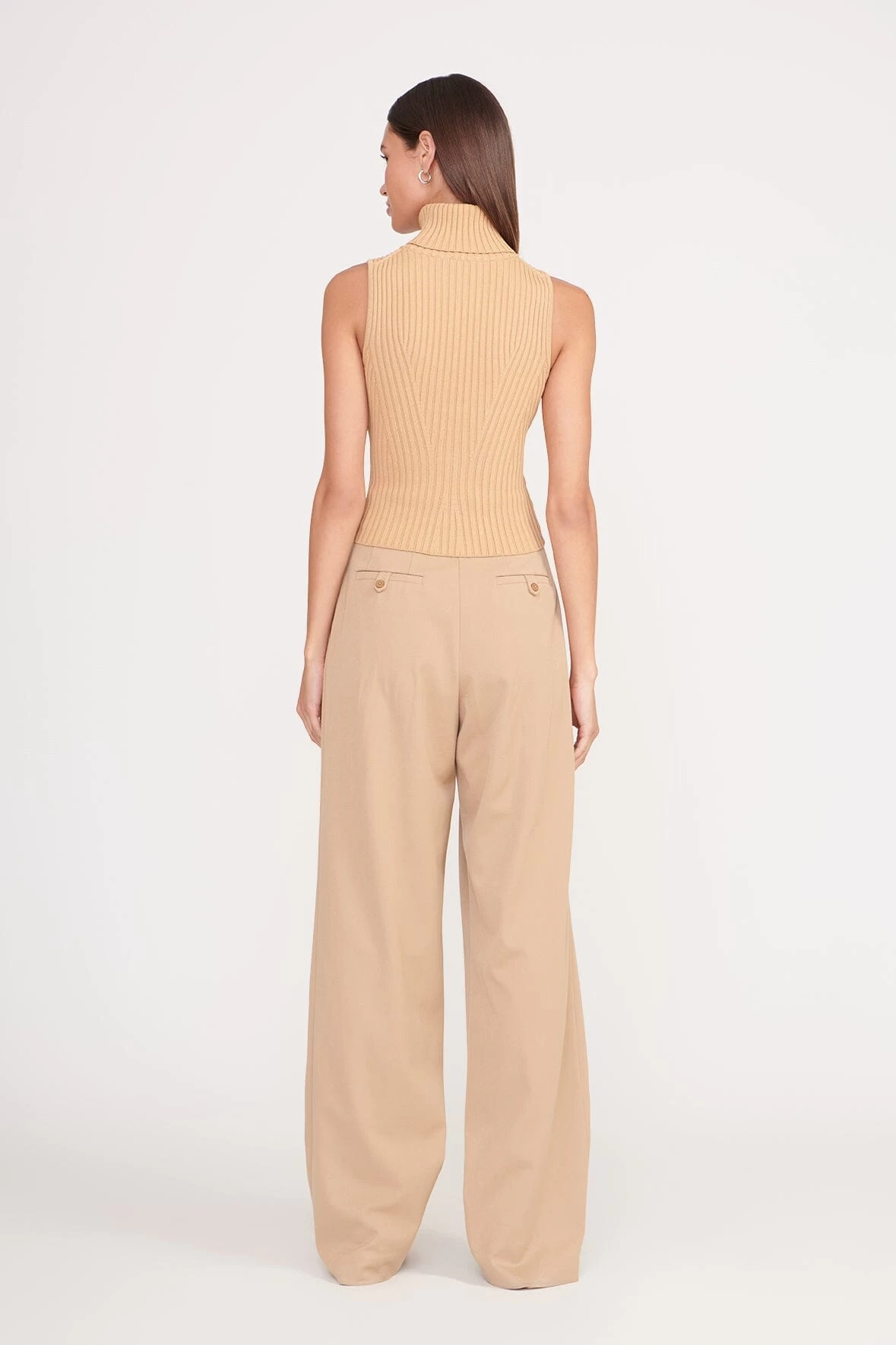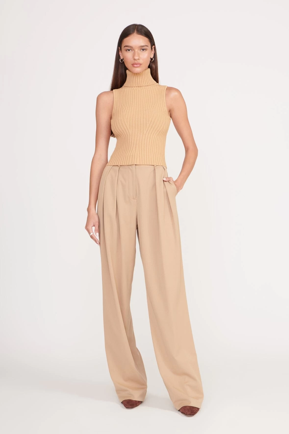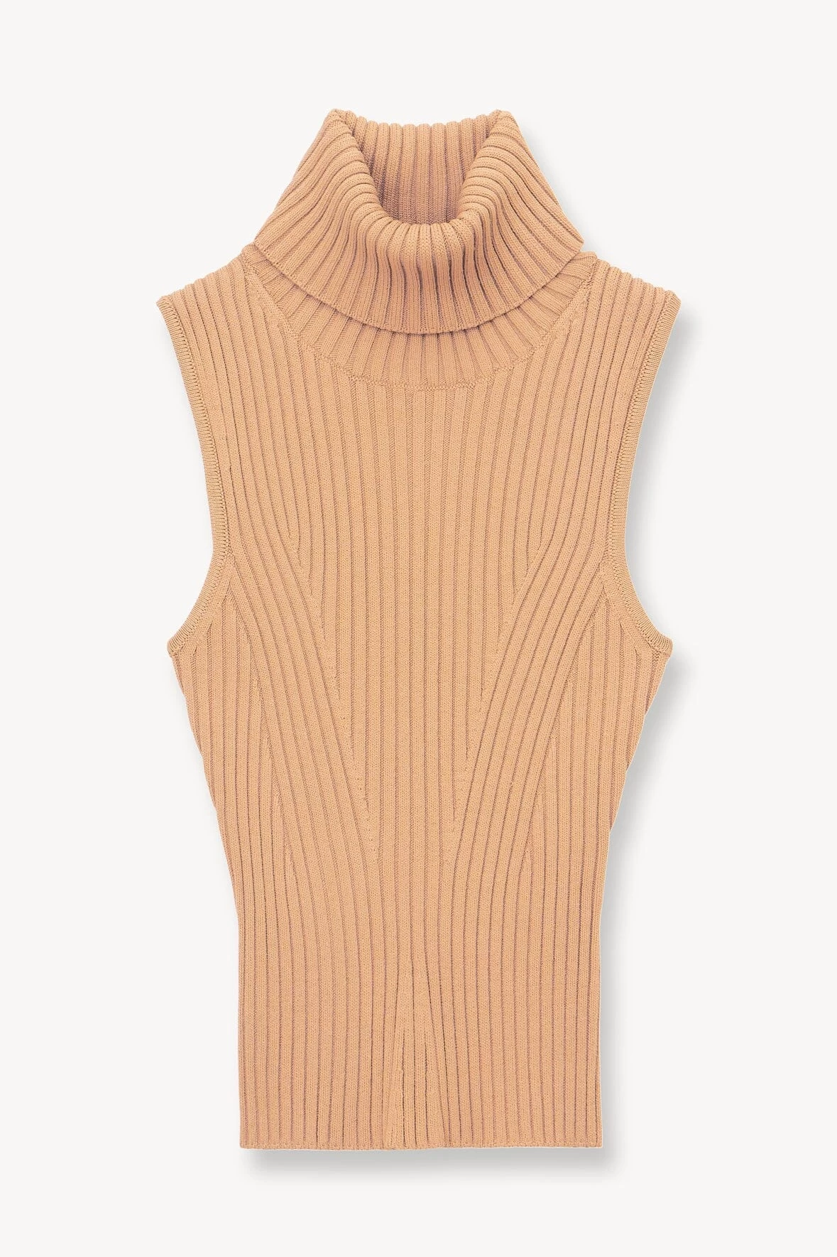 A sleeveless turtleneck top made out of a stretchy rib knit fabric. This style offers a fitted silhouette and full fashioning pattern throughout.