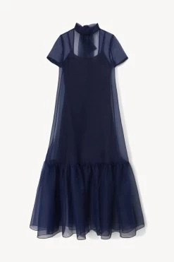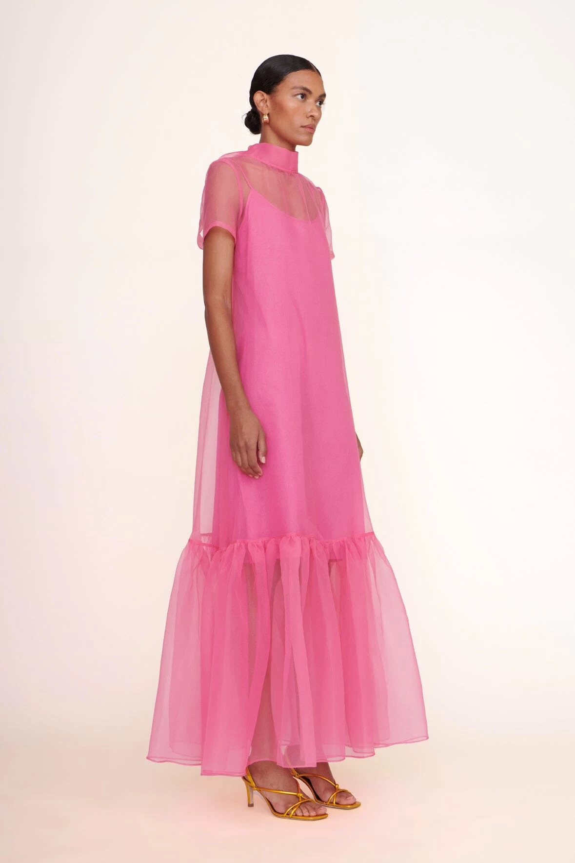 The Calluna Dress is a high neck organza gown with scoop back and functional neck tie. This style features a tiered ruffle hem.