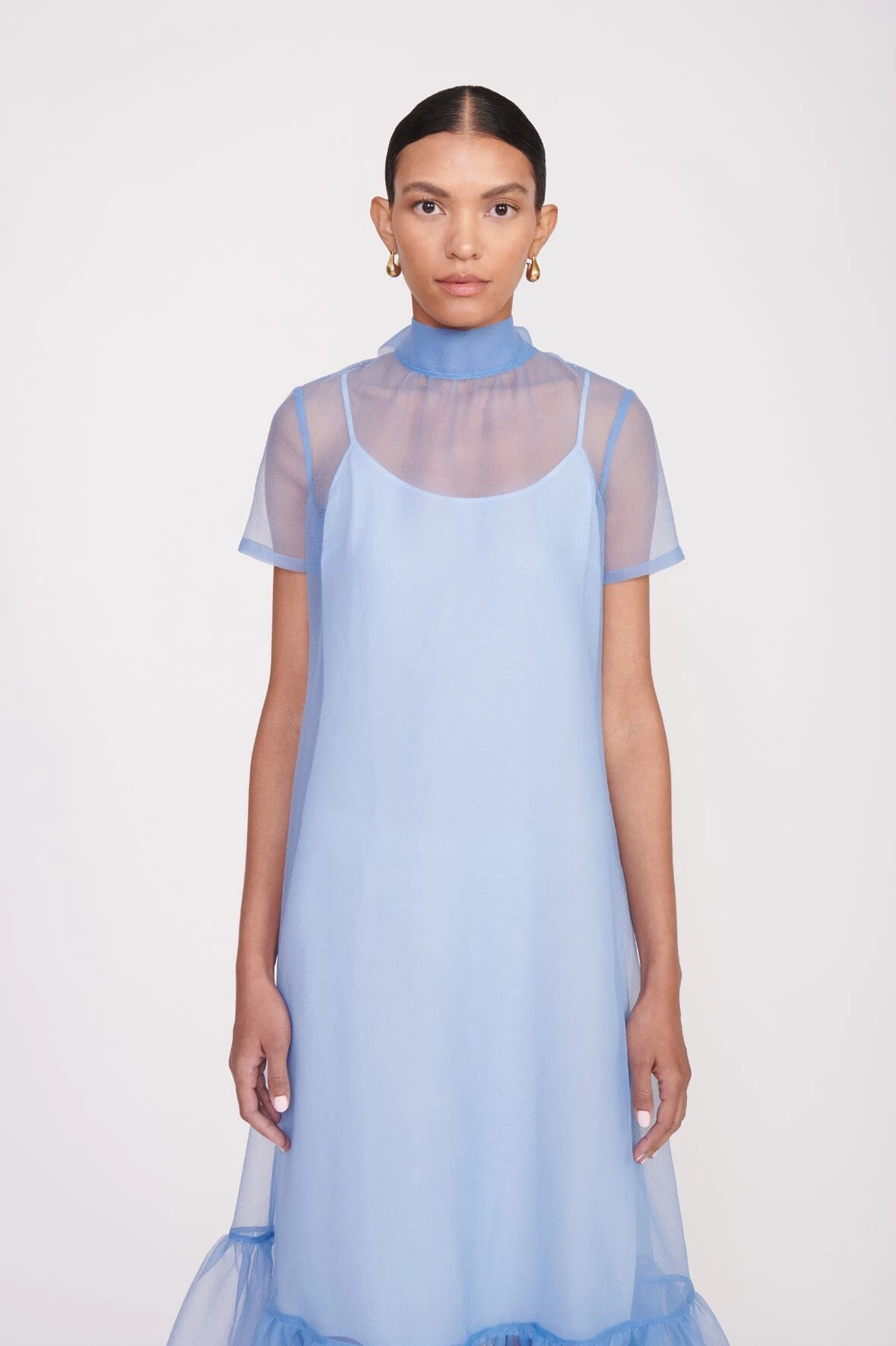 The Calluna Dress is a high neck organza gown with scoop back and functional neck tie. This style features a tiered skirt ruffle hem.