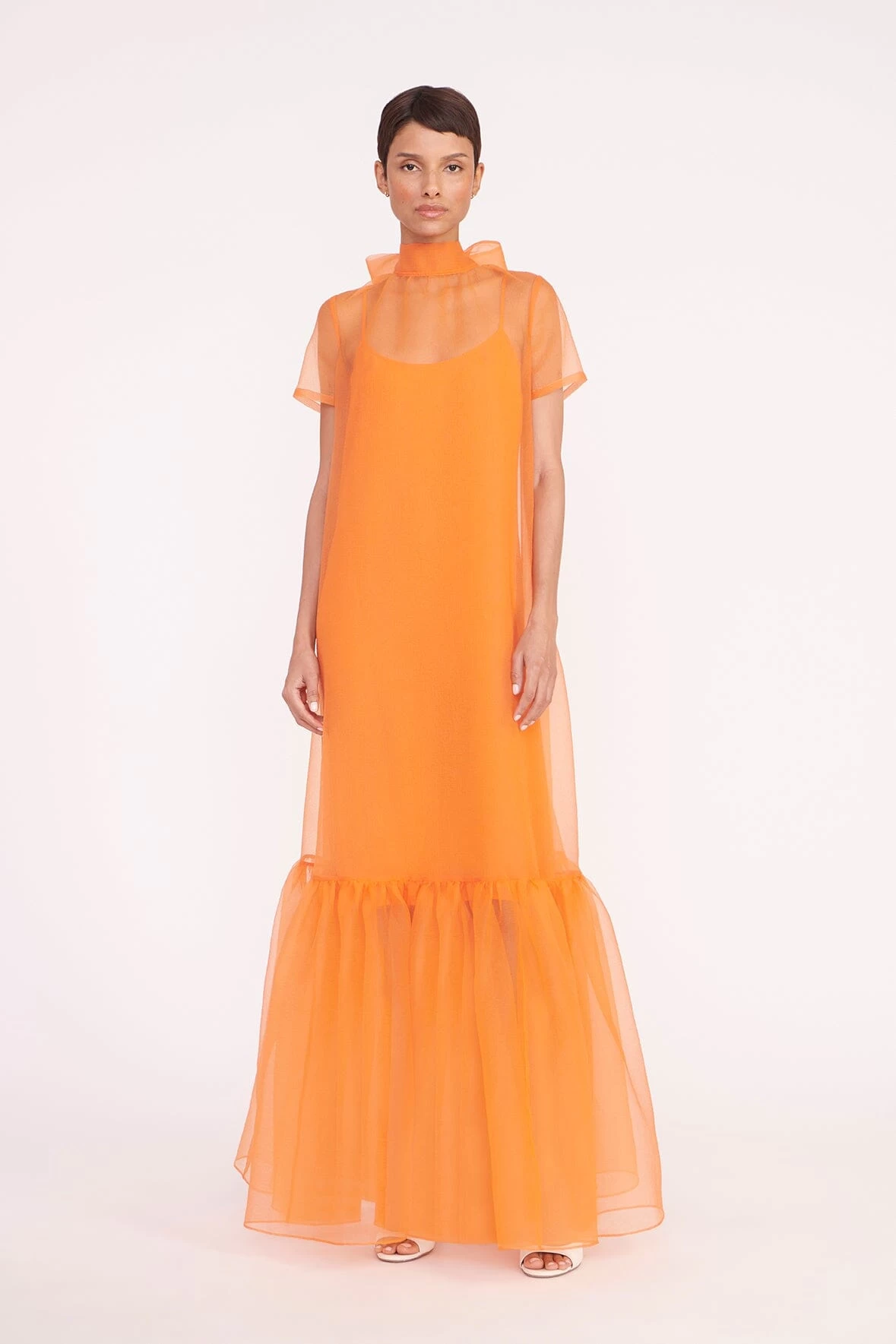 The Calluna Dress is a high neck organza gown with scoop back and functional neck tie. This style features a tiered skirt ruffle hem.
