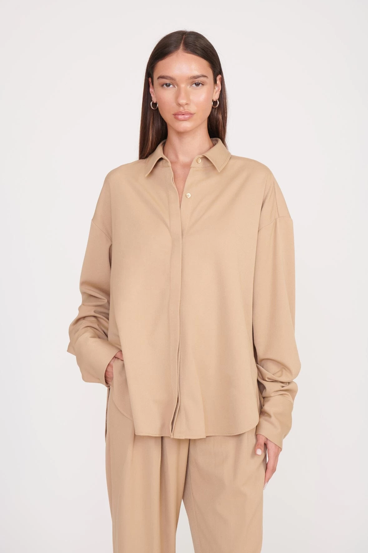 An essential button down shirt, the Colton offers a comfortable oversized fit for easy layering. This style is constructed out of a classic suiting fabric and completes a set when worn with the matching Luisa Suiting Pant.