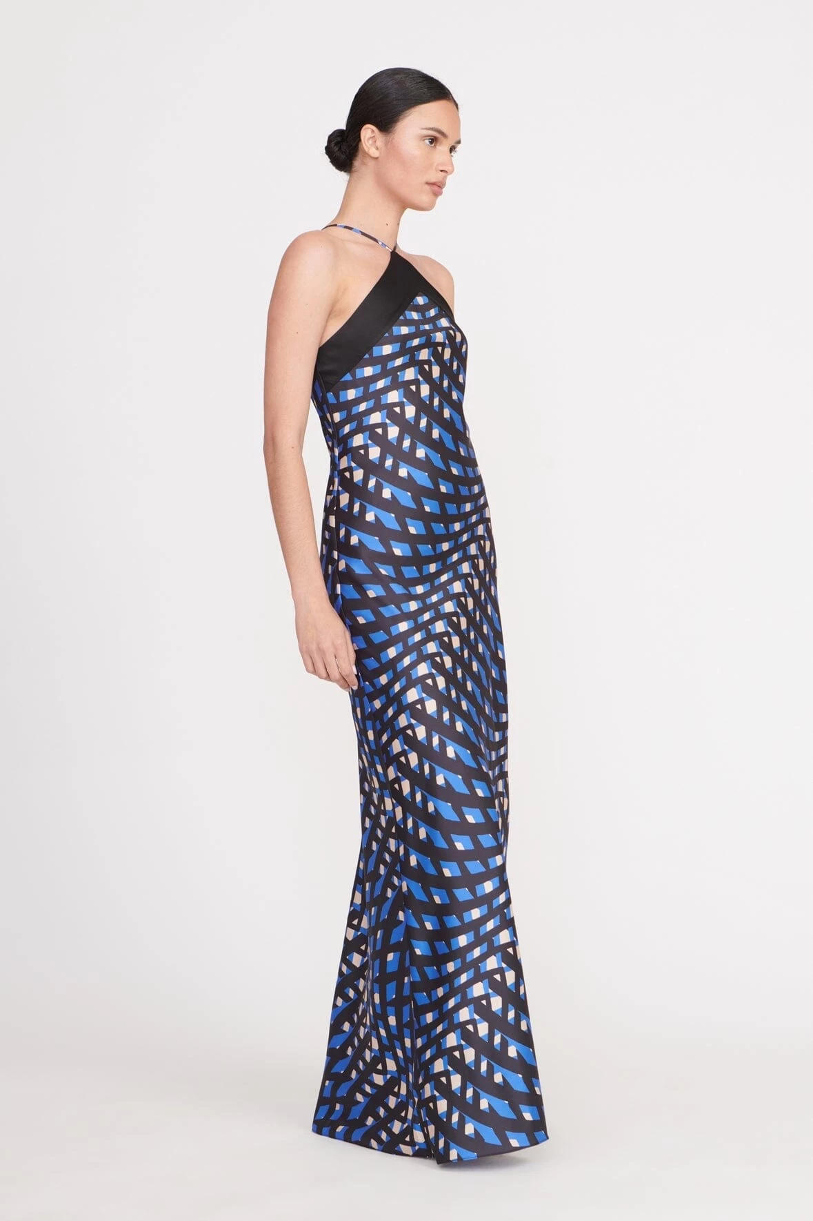A fitted bias maxi dress in updated in an argyle-inspired abstract pattern. The Cubism Dress features a halter neckline and adjustable crossover straps at the back.