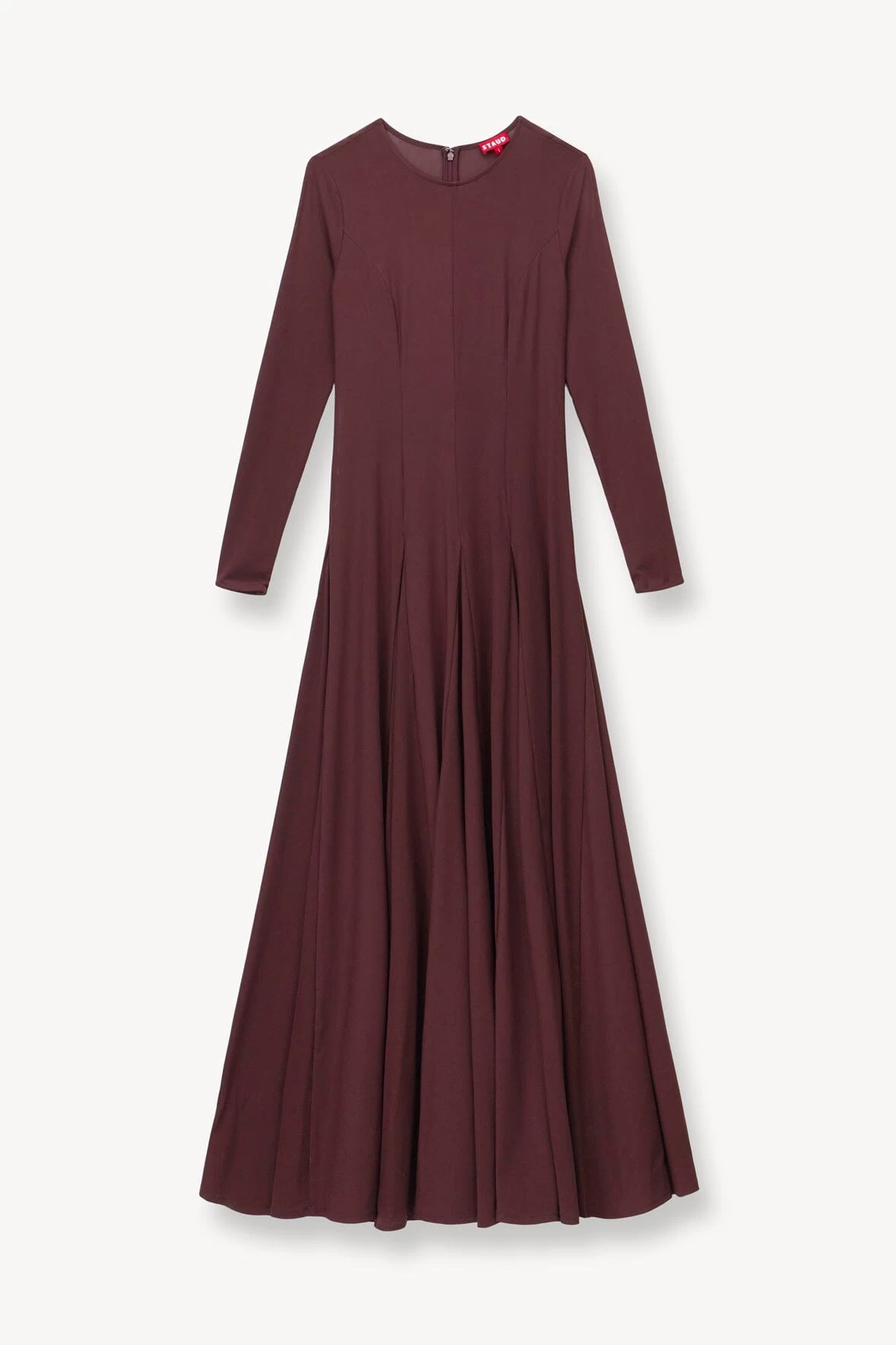 A long sleeve mesh maxi, the Donovan Dress features a flattering corset seaming at the bodice. This style includes a mesh slip and a crew neckline.