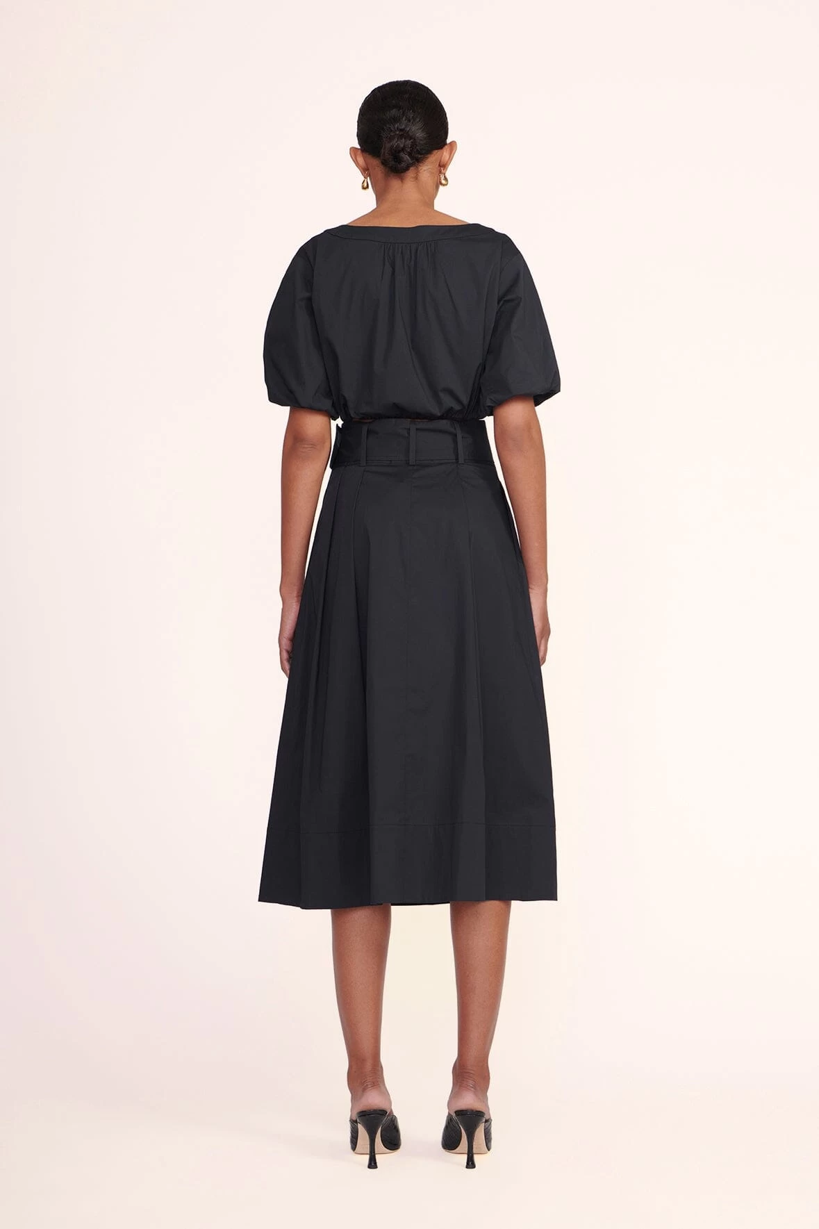 Made out of stretchy cotton poplin, the Ellington is a cropped button down top with balloon sleeves and adjustable tie hem. This style completes a coordinating set when paired with the matching Kingsley Skirt.