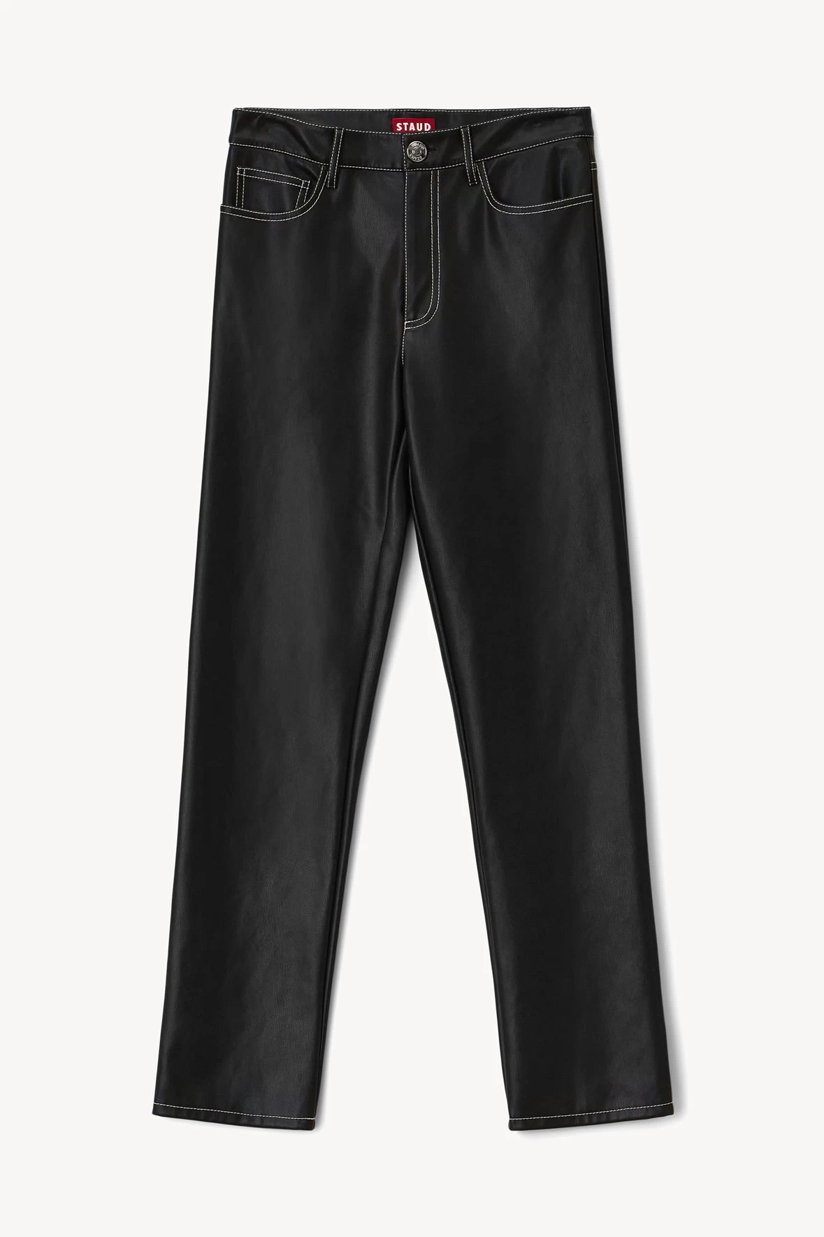 The Elliot Pant is a full length, tailored vegan leather pant. This style features a five pocket design, button zip closure and a straight leg.