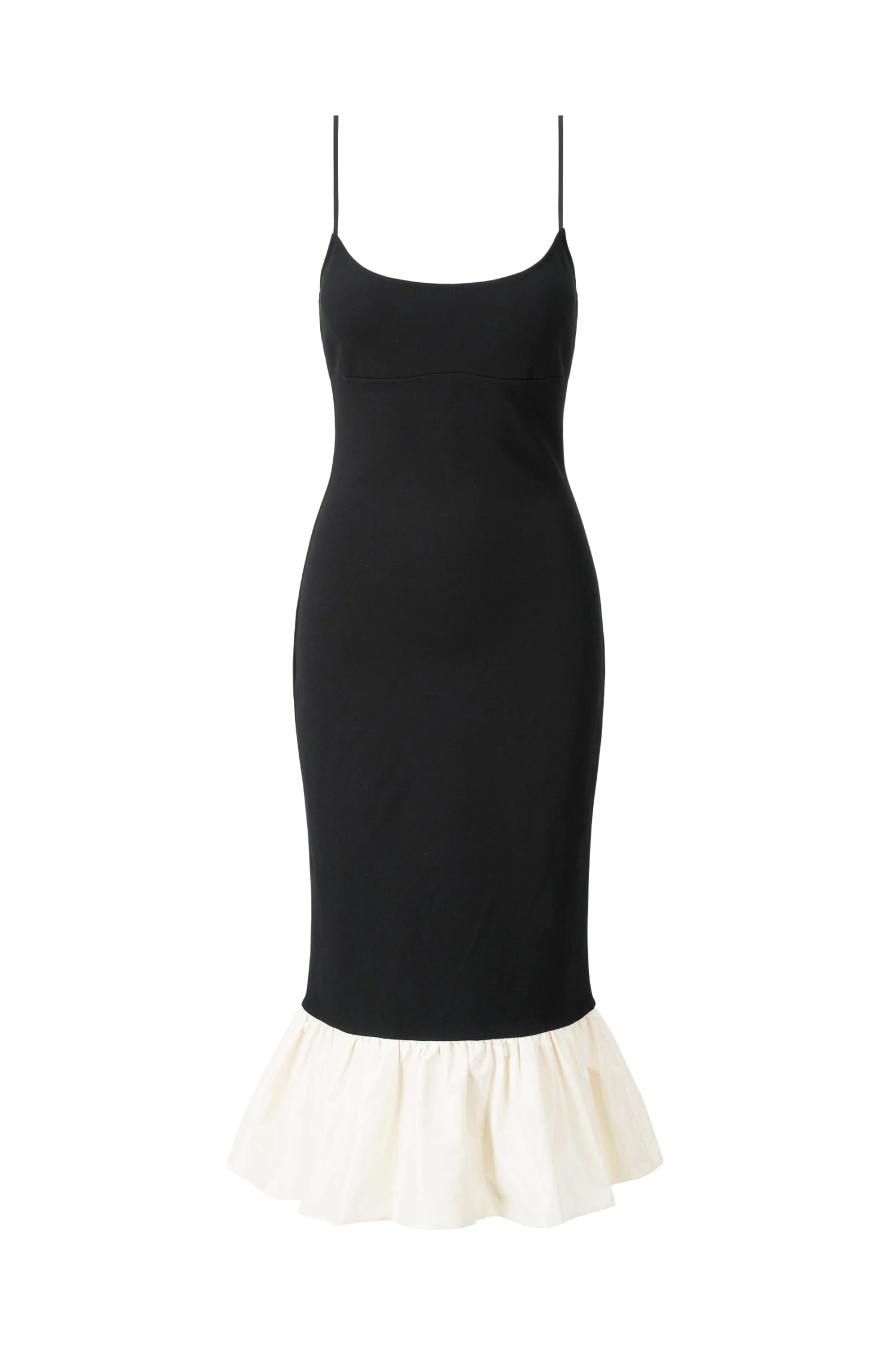 The Faridah Dress is a playful update to a little black dress, with a fitted ponte fabric bodice and a voluminous trumpet bubble hem in ivory taffeta. This style features adjustable spaghetti straps and a hidden zipper.