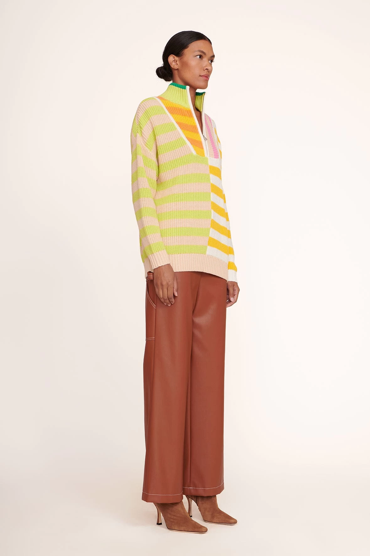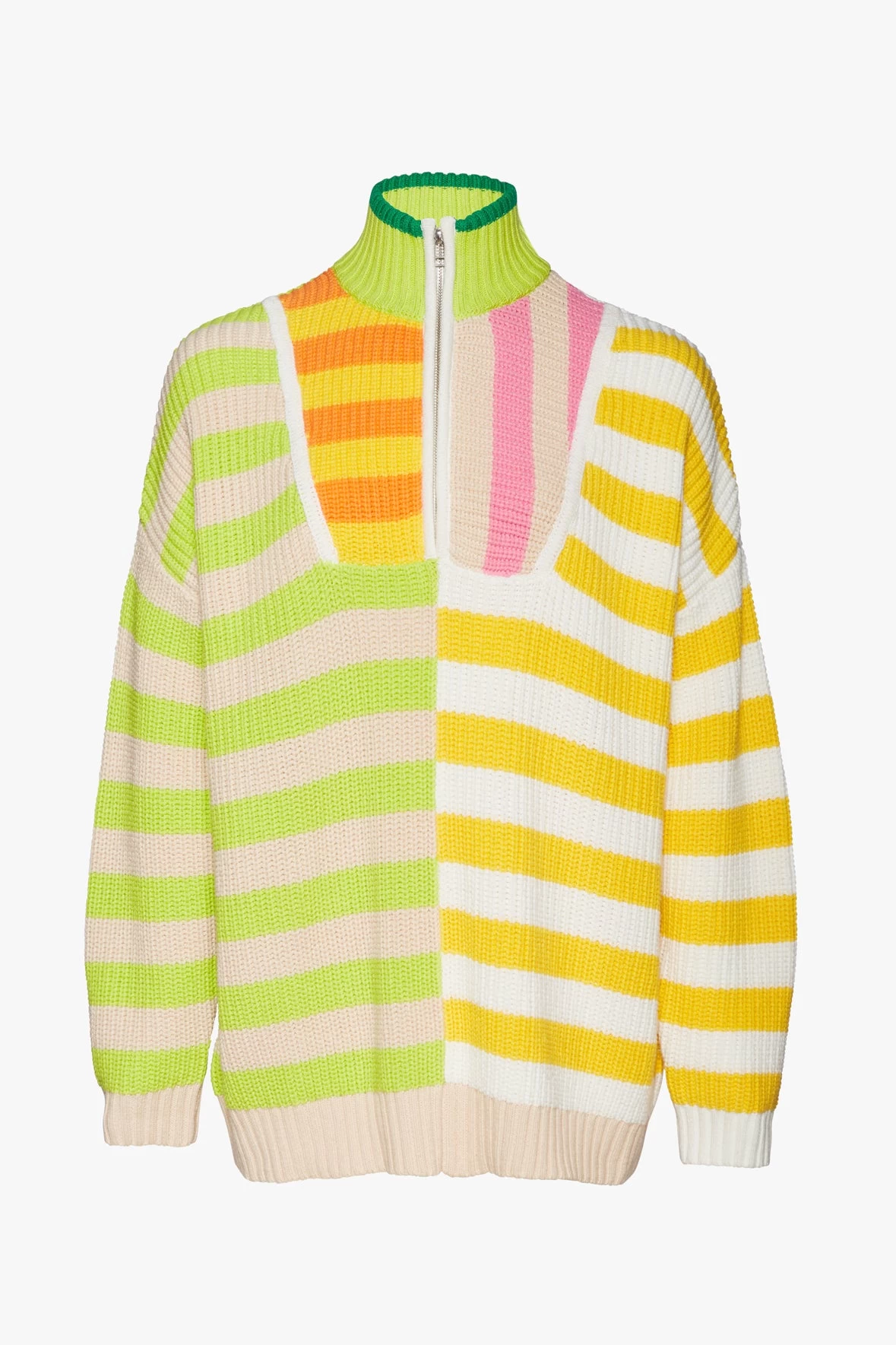 Our chunky cotton knit Hampton Sweater is an oversized boyfriend-style sweater in a bright, colorful stripe pattern. This style features a half-zip detail at the front.