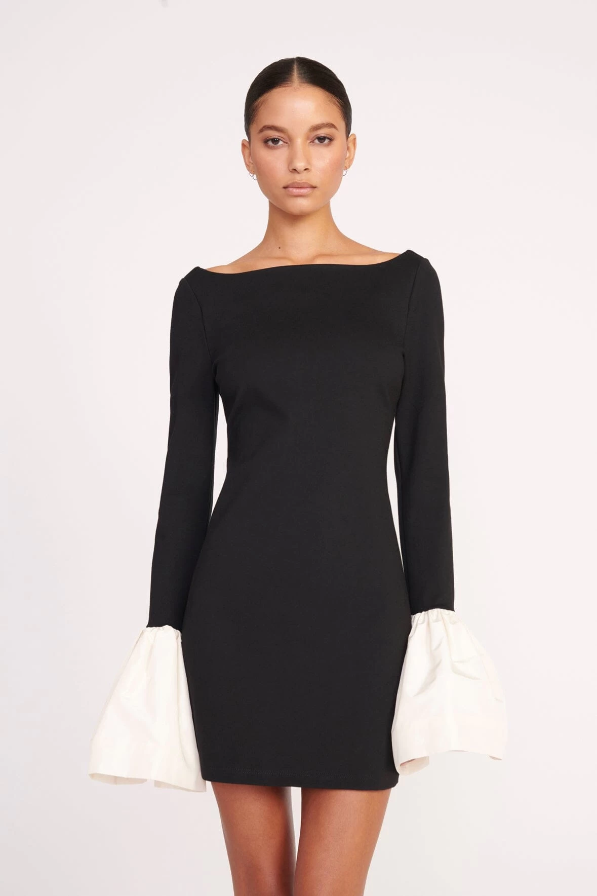 The Hawthorne Dress a cocktail dress made in our comfortable ponte fabric, featuring voluminous ivory taffeta cuffs for a playful holiday look.