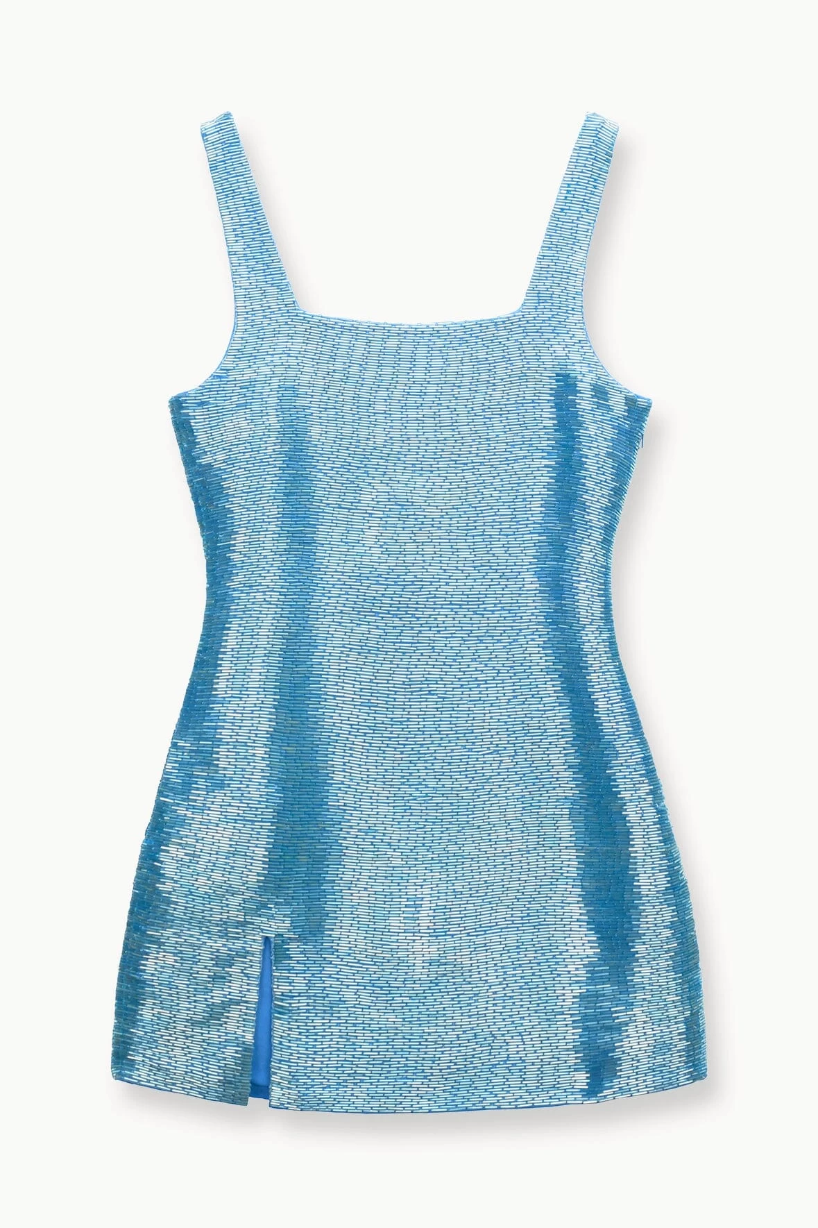 Our classic Le Sable mini dress silhouette updated in metallic bugle beads. This statement piece features a single leg slit and hidden zipper closure at the side