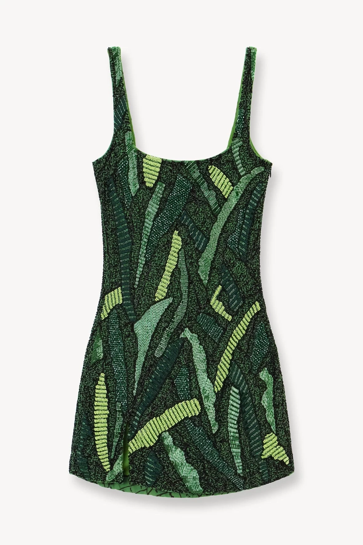 A fully hand-beaded mini dress with a right side leg slit, this style features an all-over palm leaf print in shiny bugle beads.