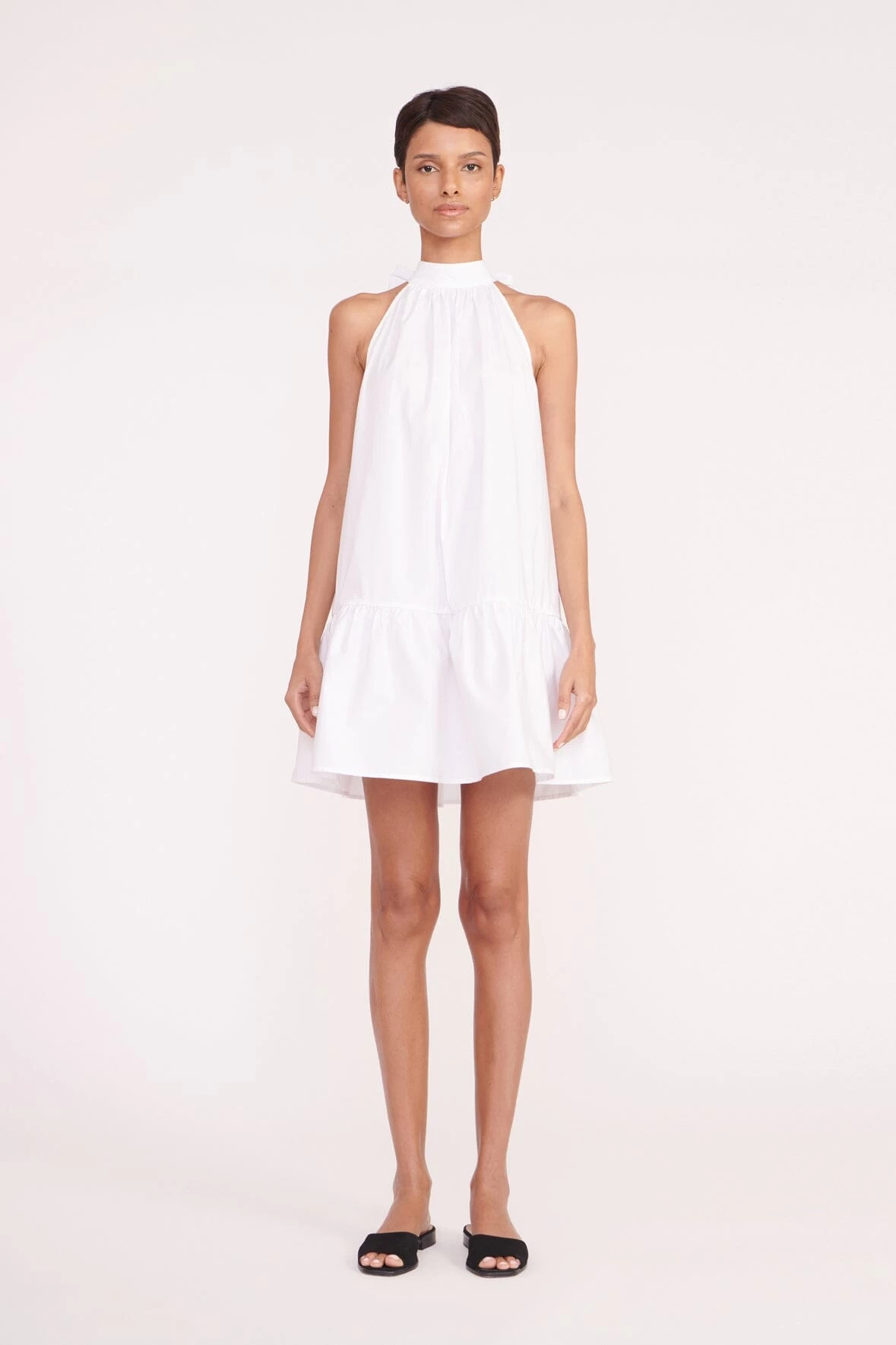 An easy a-line mini dress constructed out of cotton poplin, the Marlowe features a neck tie detail and peplum hem.