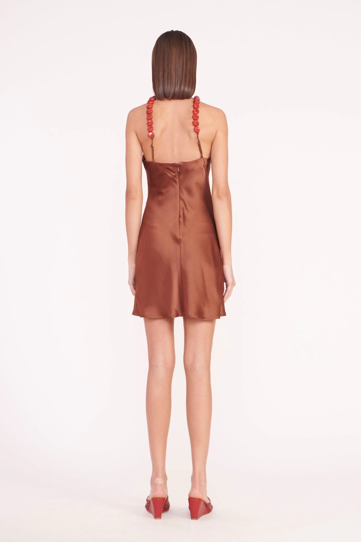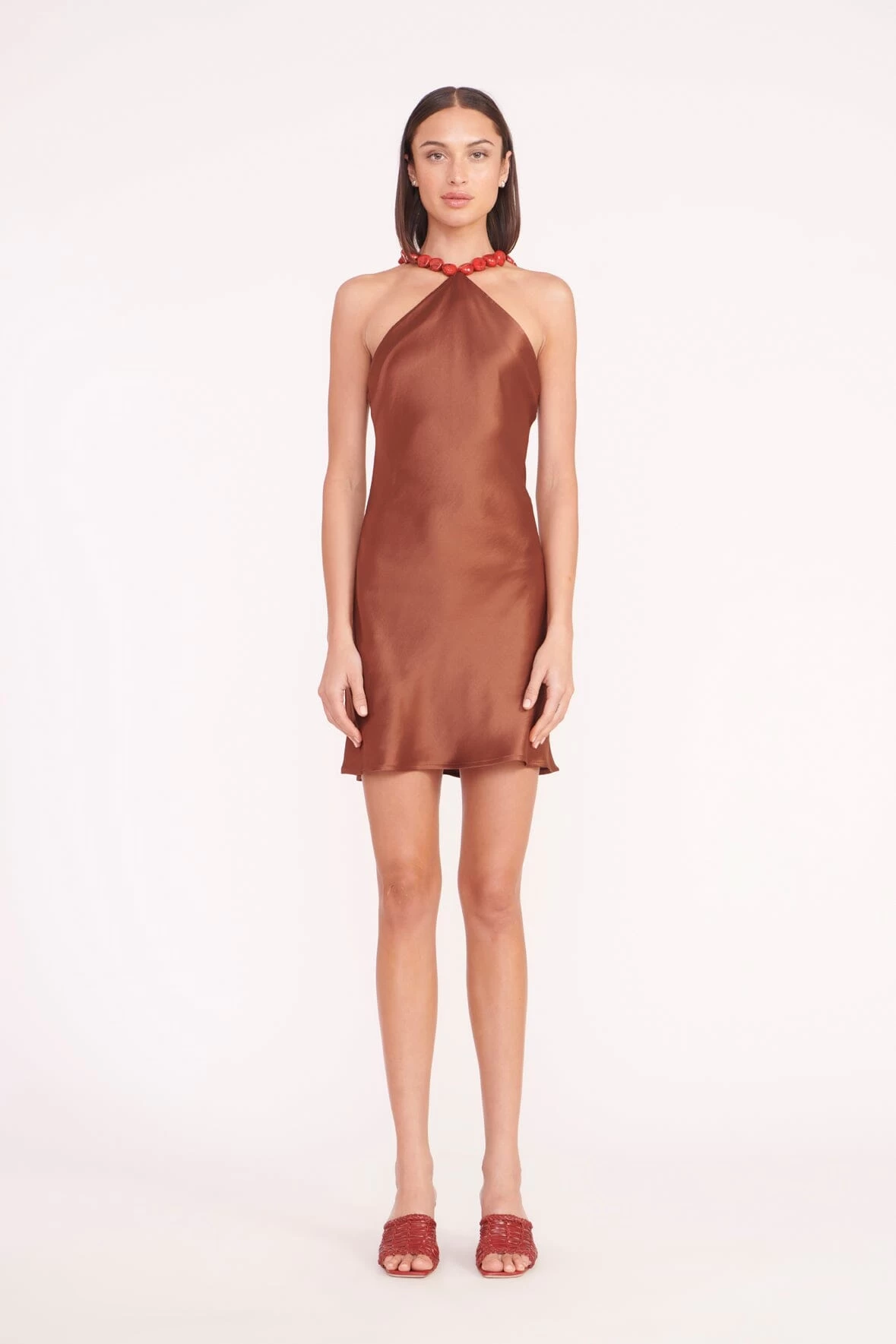 A halter neck slip gown crafted from a drapey satin fabric, the Mini Cadence features beaded strap details and fitted silhouette