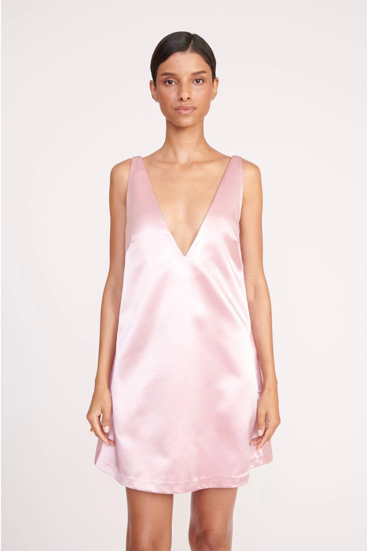 The Mini Teagan Dress is a plunging v-neckline mini dress crafted in our pale pink satin. This style is a relaxed fit throughout the body.