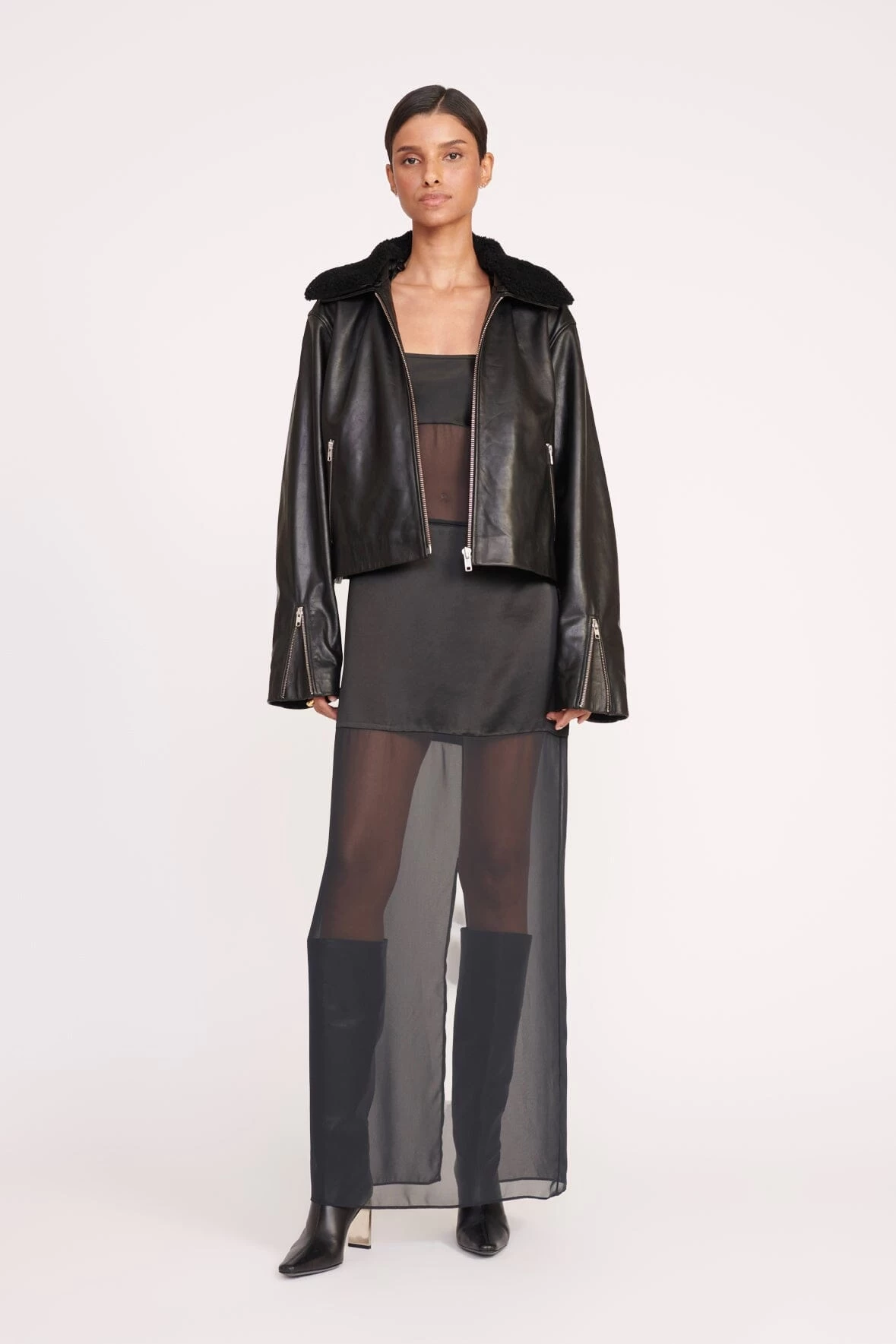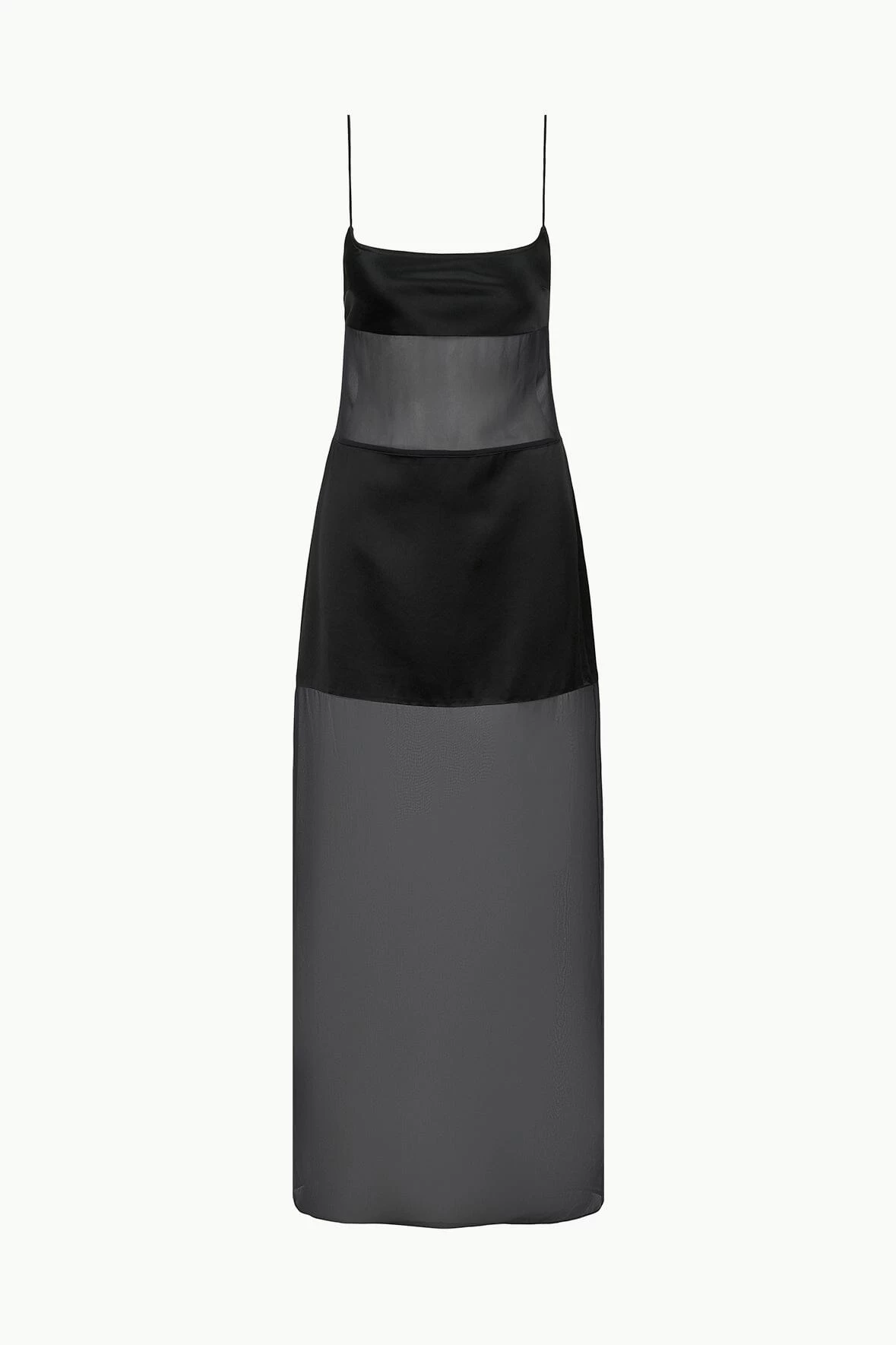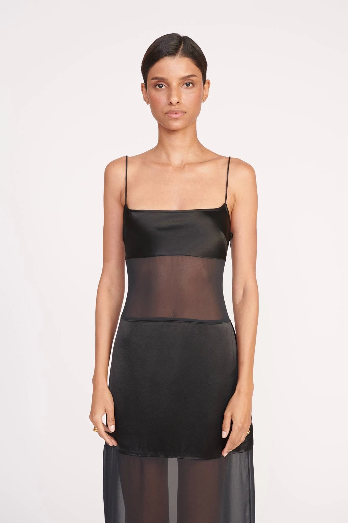 The Misty Dress is a new silhouette for the season in black chiffon with sheer panels throughout the bodice and skirt for a sexy update to a little black dress. This style has thin spaghetti straps and a back slit.