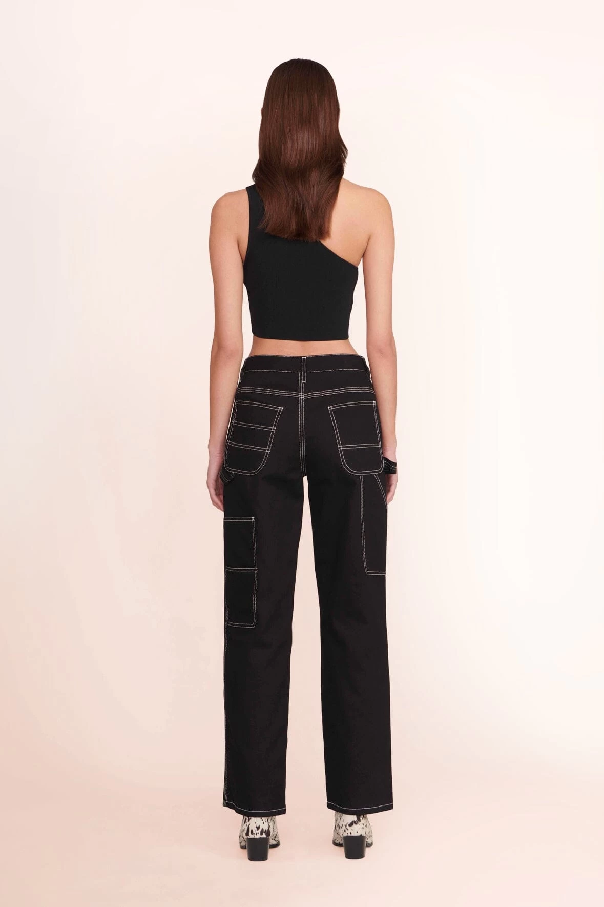 The painter pant. This denim style features a relaxed fit with slight stretch, white contrast top stitching, cargo patch pockets and hammer loop details at the side.