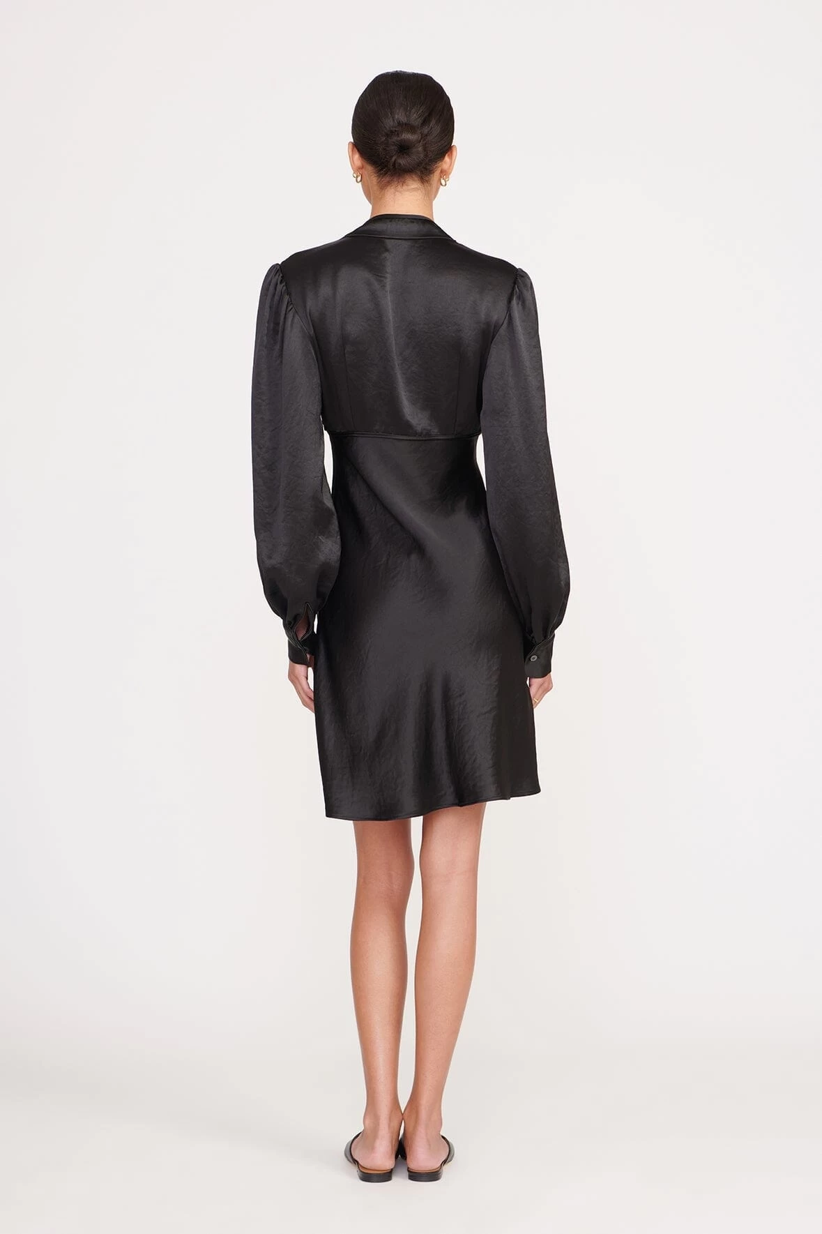 The Rosenda Dress is a satin bias cut mini dress with curved seams at the chest. This style has a fitted bodice and full sleeves with cuffs.