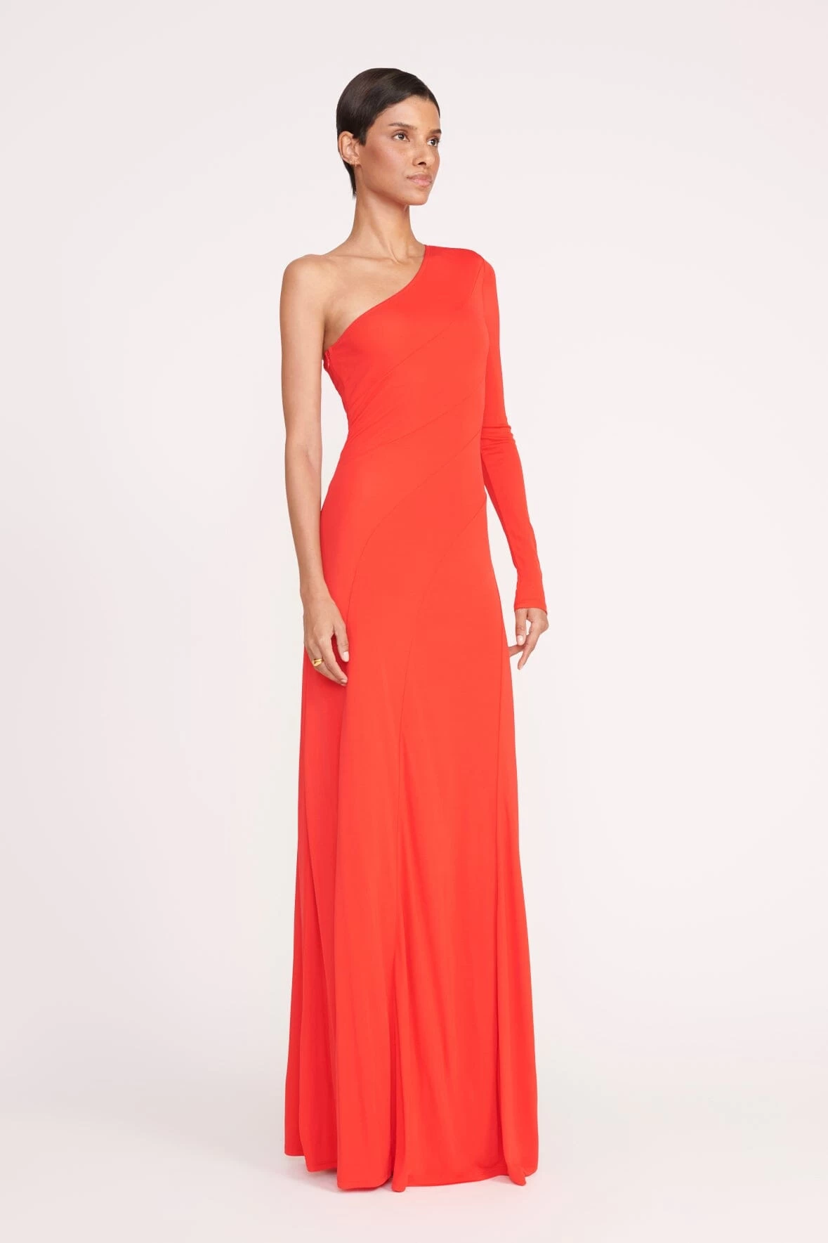 The Serena Dress is a one-shoulder maxi dress with asymmetrical seams throughout the body for a sleek and flattering look. This style is made out of a slinky jersey fabric and features a side zipper.
