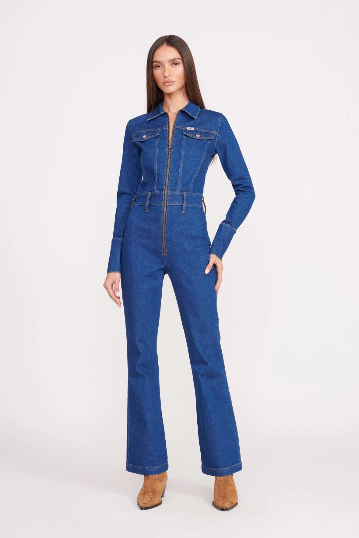 The Body Jumpsuit is our sexy fitted denim jumpsuit. This style features a zip-front, two snap pockets at the chest, and our STAUD belt loop detail at the waist. The jumpsuit is fitted through the body and has a flared leg.Â