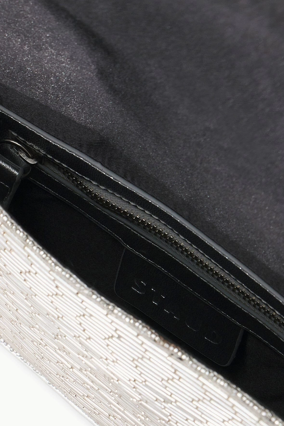 The new Tommy for Fall. The classic hand-beaded shoulder bag with vegan leather piping. This Tommy update features an all over monochromatic bugle bead design with a magnetic snap closure.