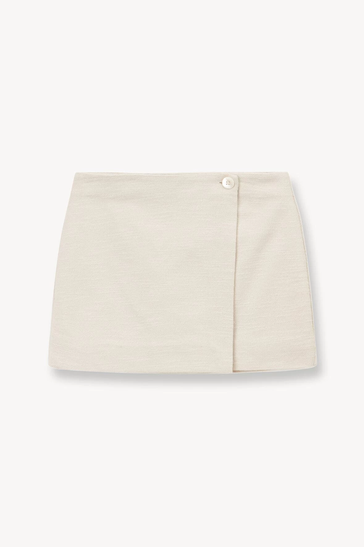 A mini wrap skirt with button closures, this style is constructed out of a cotton suiting fabric and offers a fitted silhouette.