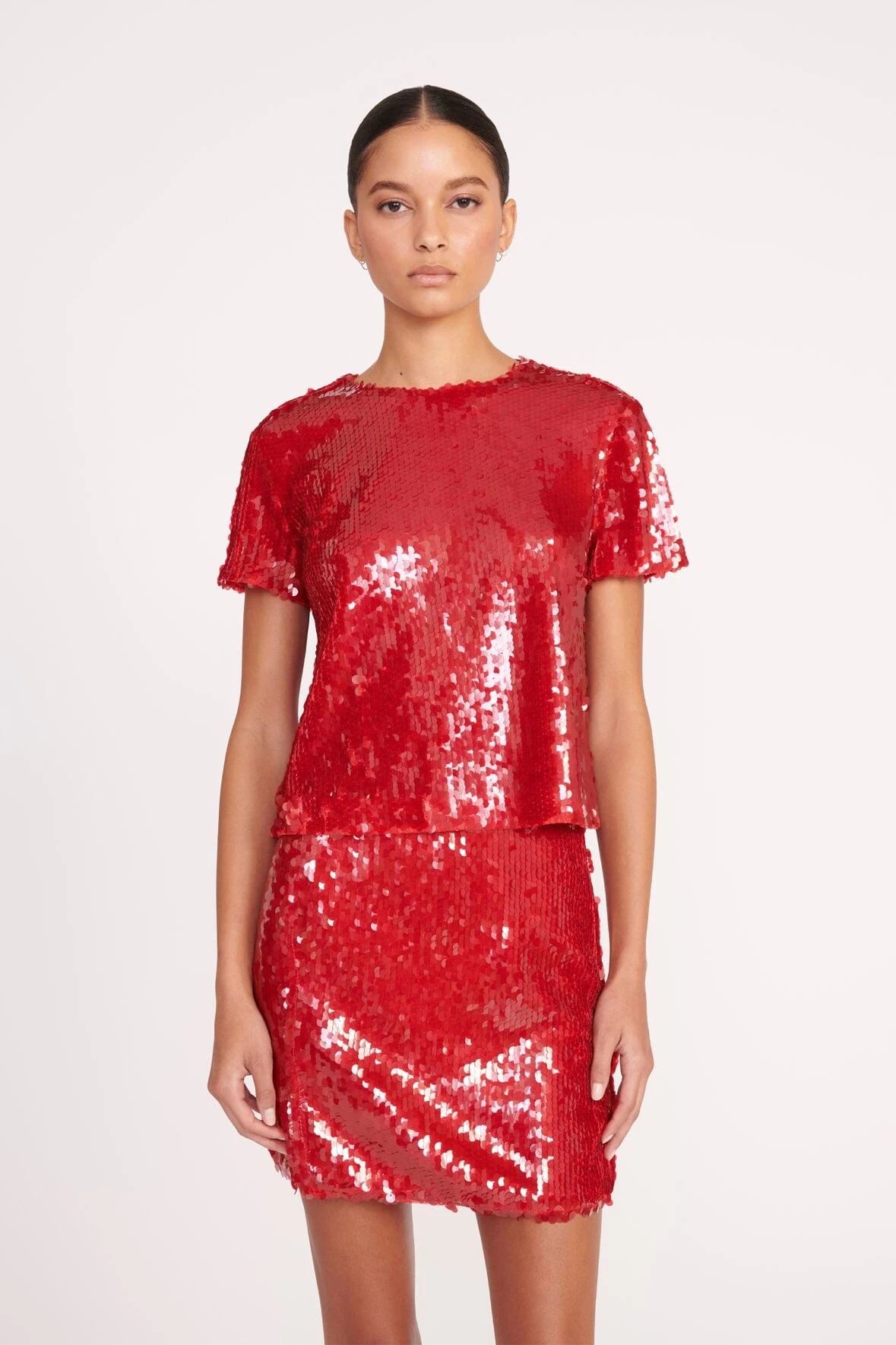 Our newest party skirt, The Vedette is a mini skirt with all over paillette embellishment. This style features a side zip and pairs perfectly with our Quincy Top.