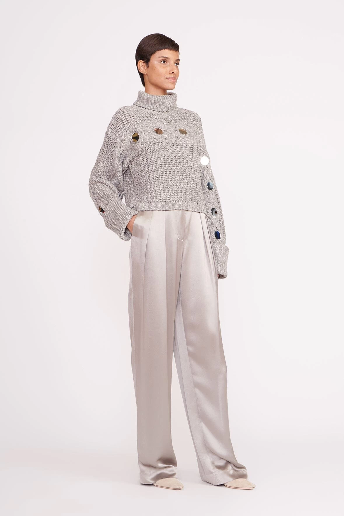 A chunky knit turtleneck with cropped, boxy fit. The Vernacular Sweater features a honeycomb cable stitch detail, embellished with mirrored paillettes, and oversized cuffs.