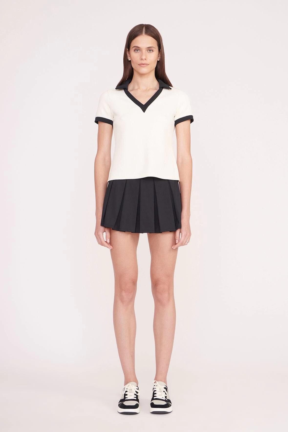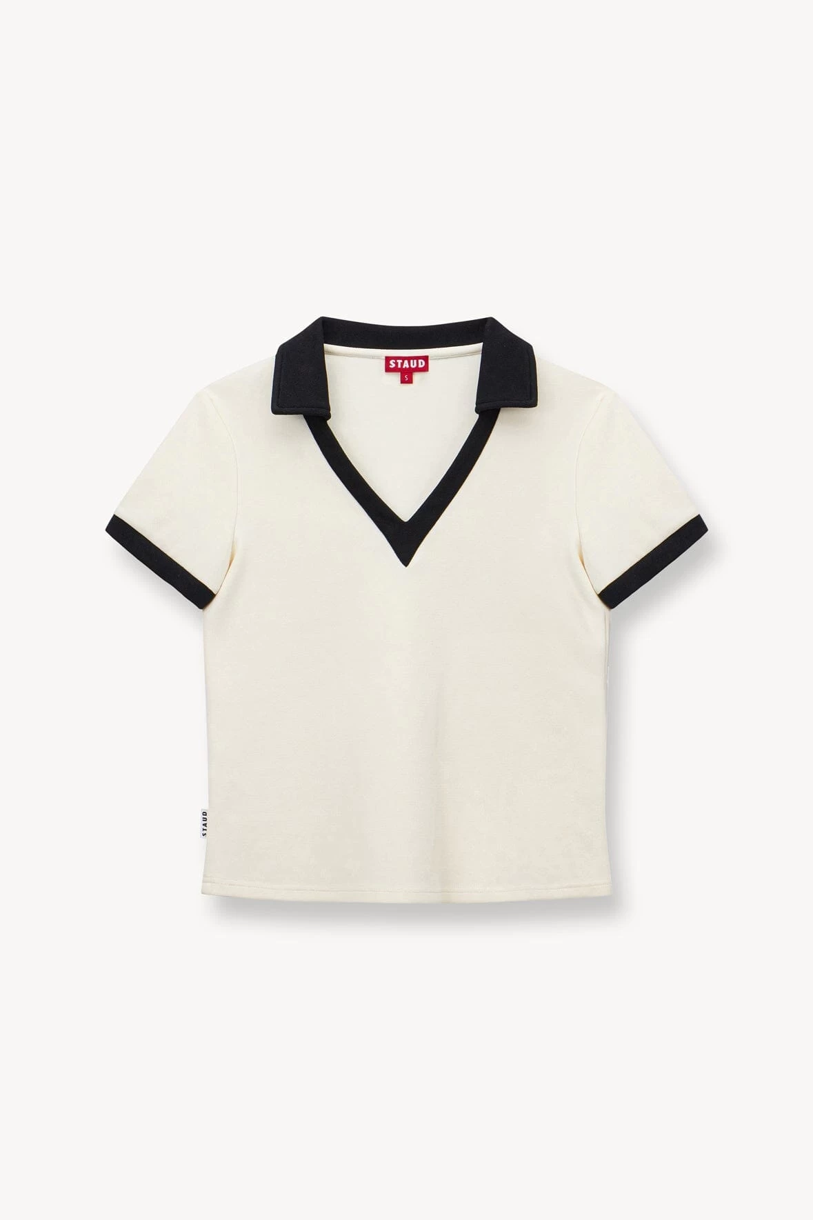 Cotton pique v-neck polo with contrast collar and sleeve bindings. The Volley Top offers a relaxed silhouette and completes a set when paired with the matching Doubles Skirt.
