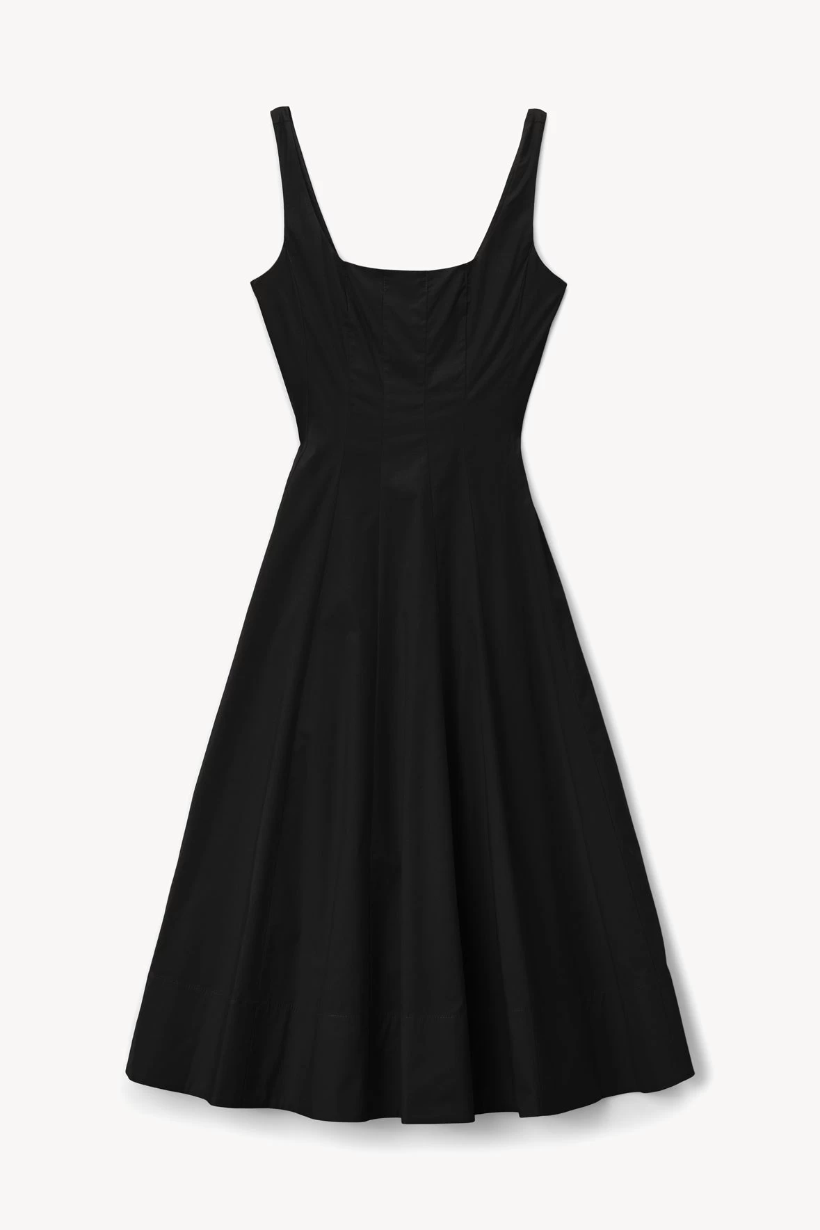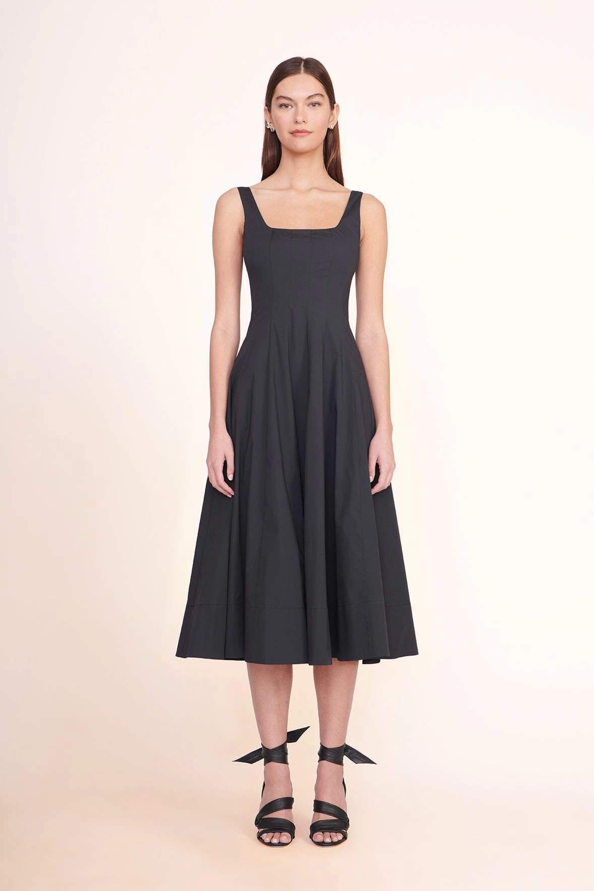 The Wells Dress features a corset-style panel construction to create a flattering, fitted shape through the waist and a midi length a-line skirt. Made out of lightweight cotton poplin.