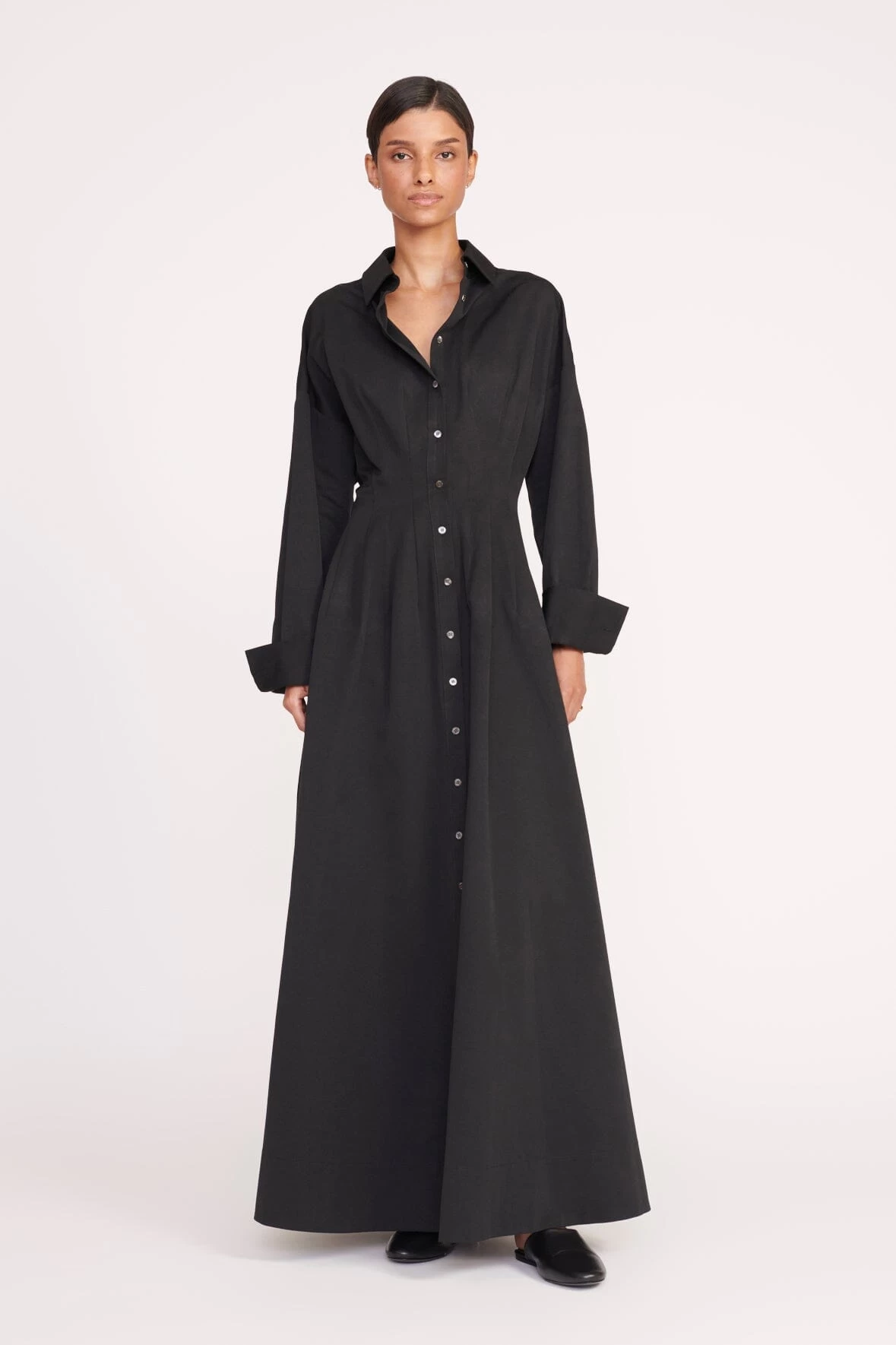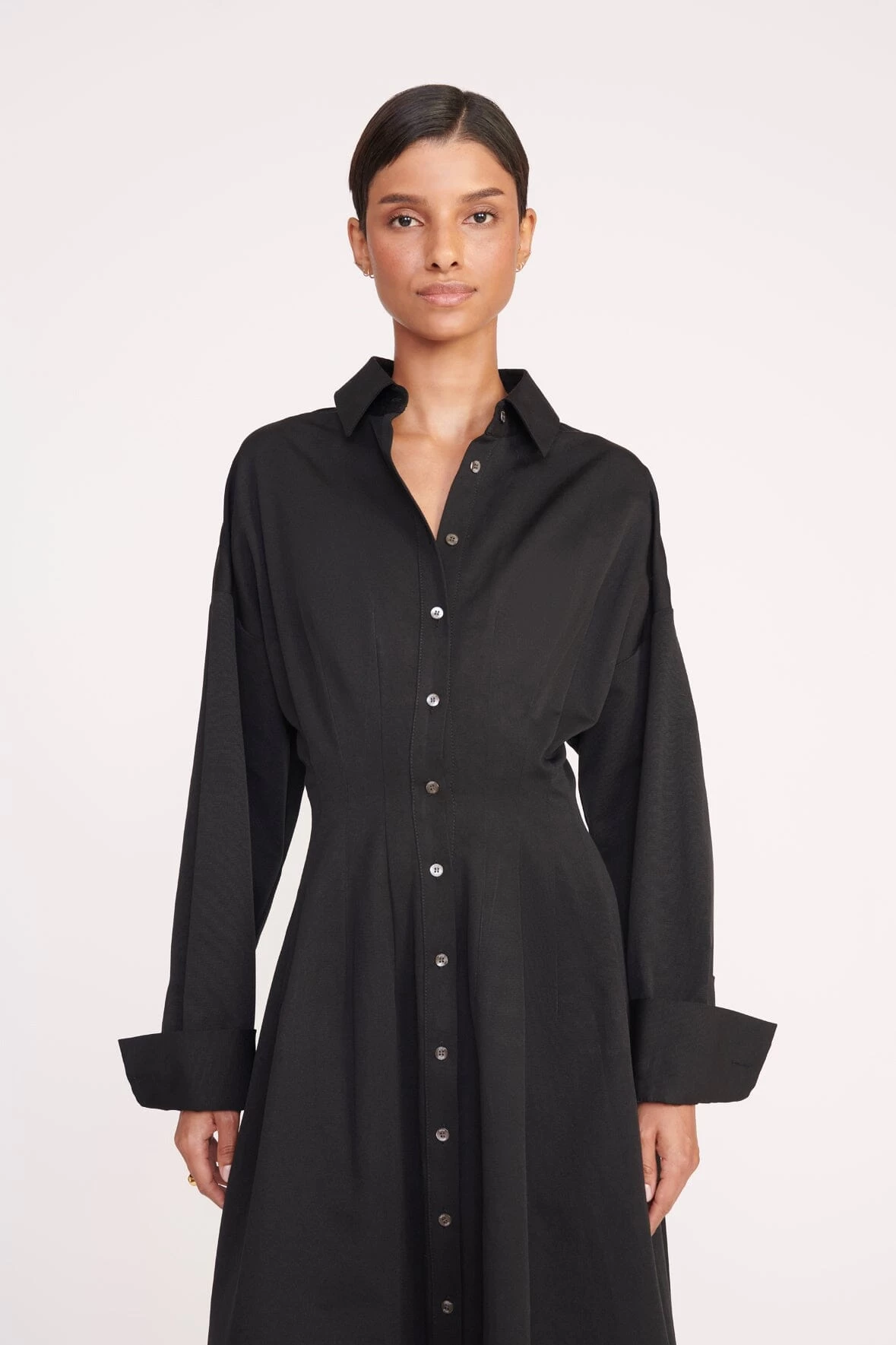 A chic button-up dress with a collar and oversized cuffs that can be worn buttoned or rolled up for an exaggerated look; The Winona Dress features a cinched waist with a comfortable elastic waistband at the back and is crafted in grosgrain.