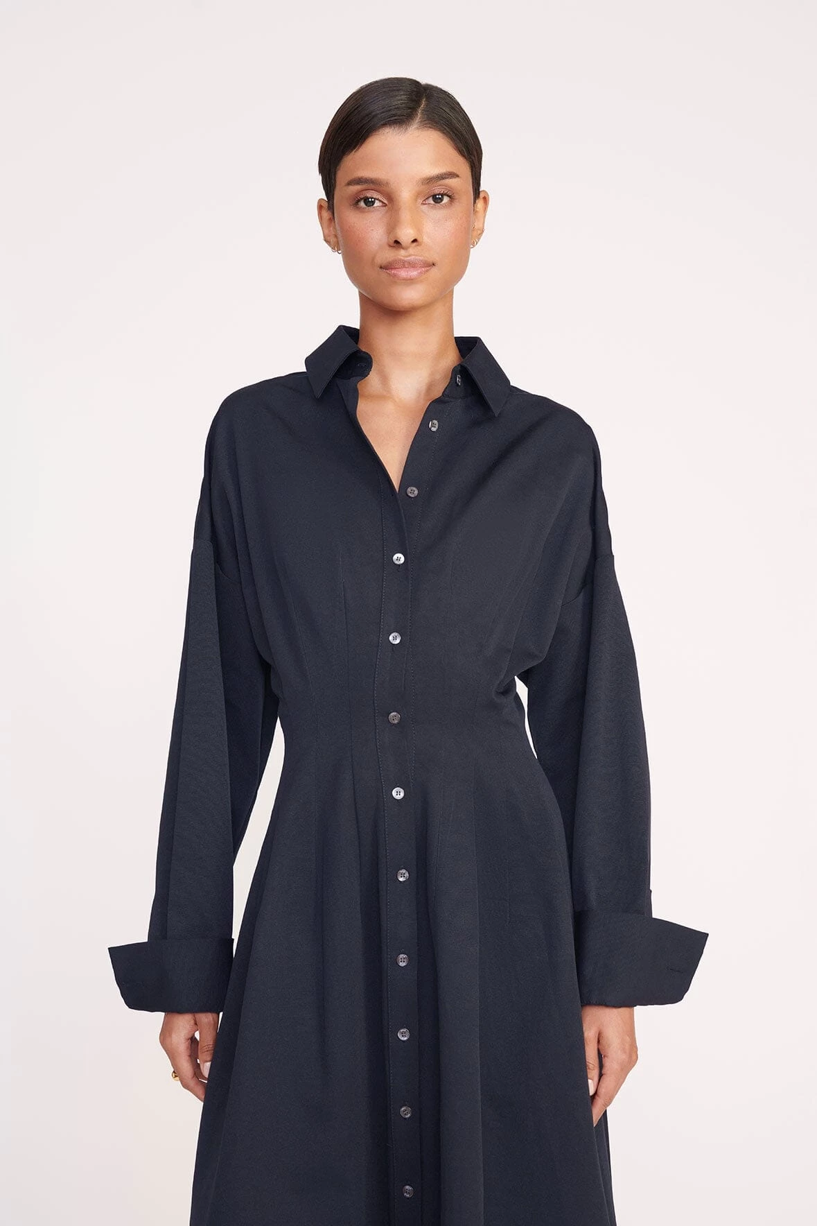 A chic button-up dress with a collar and oversized cuffs that can be worn buttoned or rolled up for an exaggerated look; The Winona Dress features a cinched waist with a comfortable elastic waistband at the back and is crafted in grosgrain.