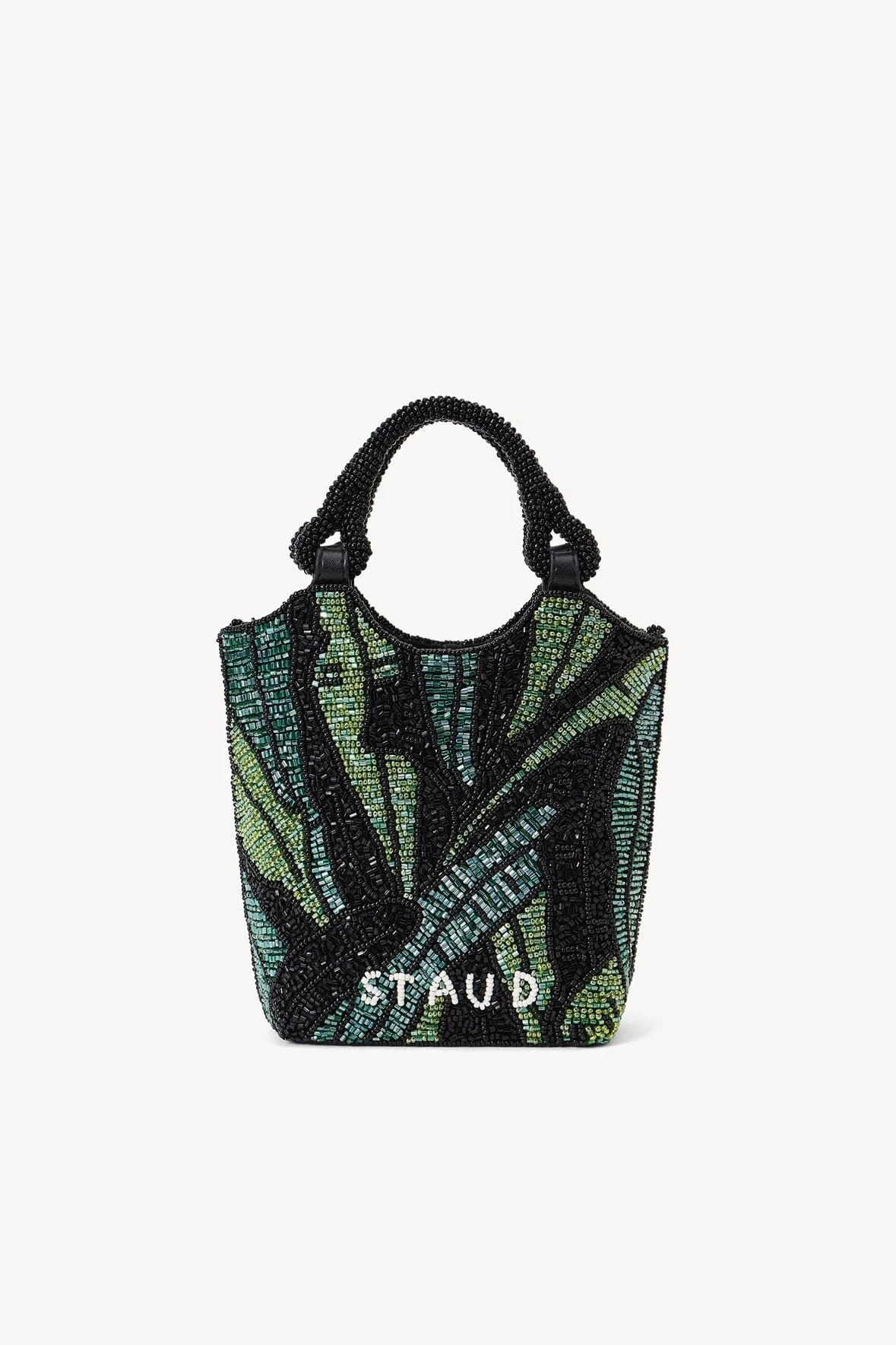 A hand-beaded mini bag with palm leaf design, the Zoe features a drop shoulder strap and tassel tie closure.